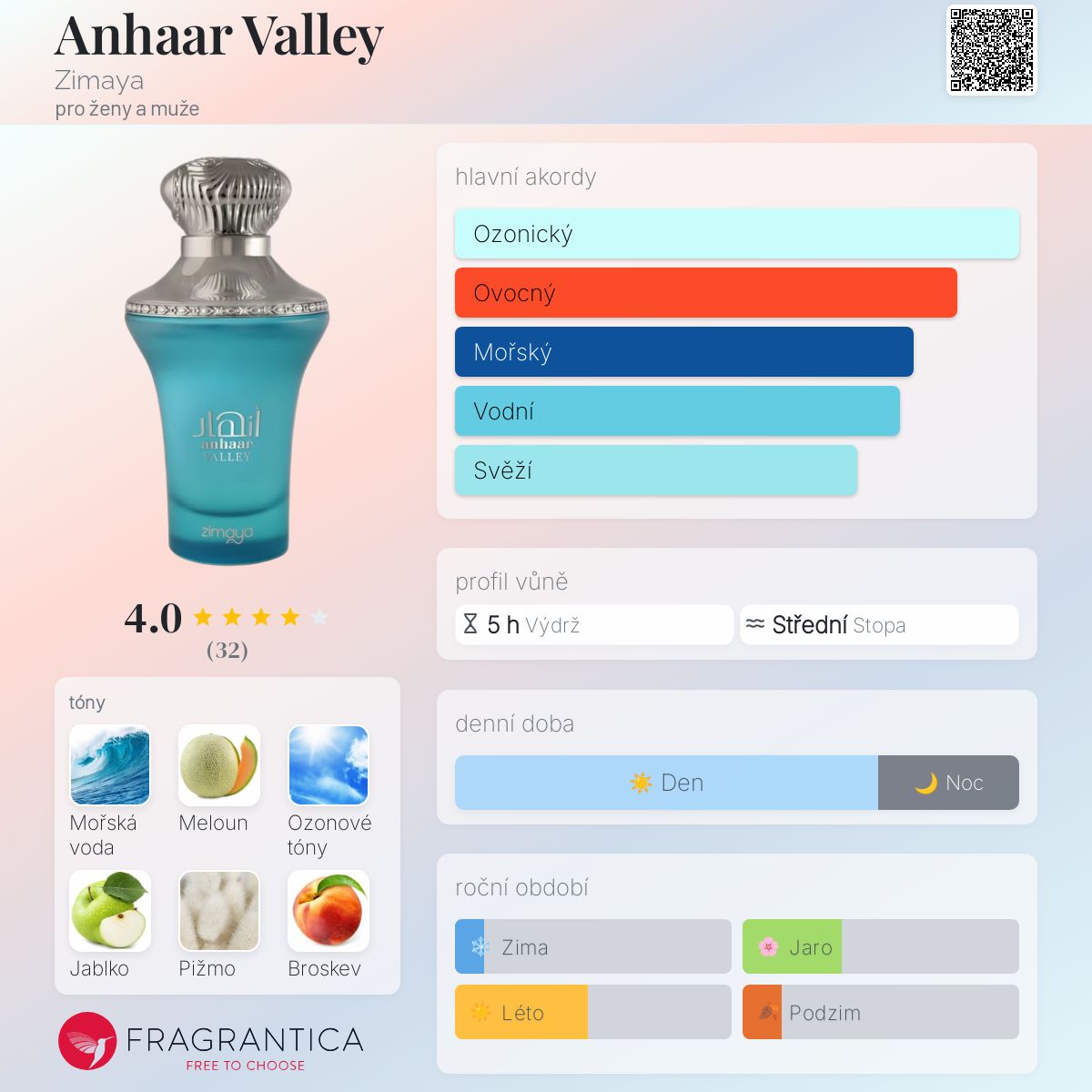 Anhaar Valley podle Zimaya je Floral Aquatic vůně pro ženy a muže. Toto je nová vůně. Anhaar Valley byl/a uveden/a v roce 2024. Vrchní tóny jsou Vodní tóny, Meloun, Jablko a Broskev; střední tóny jsouOzonové tóny a Růže ; základní tóny jsou Pižmo a Ambra.
