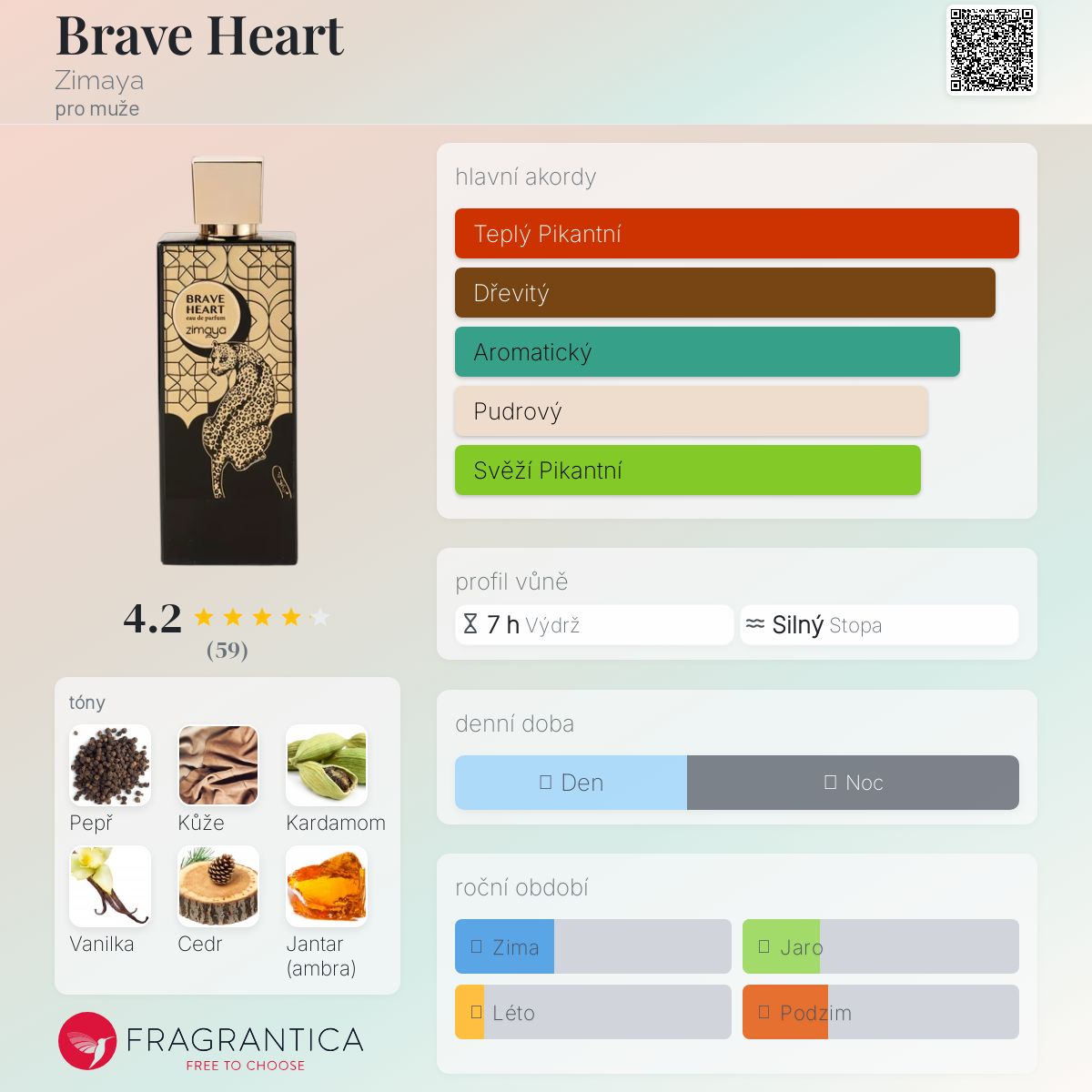 Brave Heart podle Zimaya je Aromatic Spicy vůně pro muže. Brave Heart byl/a uveden/a v roce 2023. Vrchní tóny jsou Černý pepř, Kardamom a Bergamot; střední tóny jsouKůže, Cedr a Šalvěj muškátová ; základní tóny jsou Vanilka, Jantar (ambra), Santalové dřevo a Pižmo.