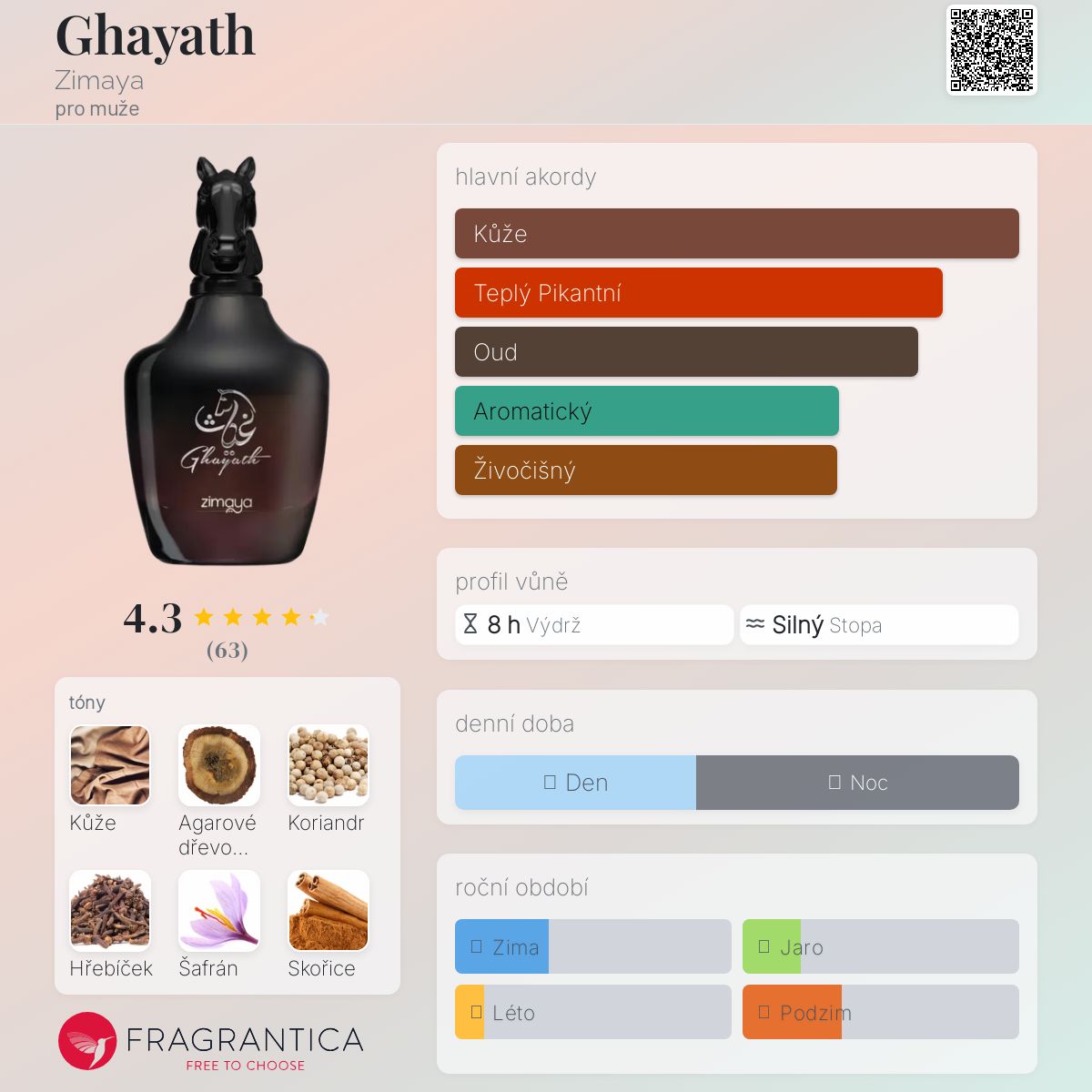 Ghayath podle Zimaya je Leather vůně pro muže. Ghayath byl/a uveden/a v roce 2023. Vrchní tóny jsou Koriandr, Bergamot a Pelargónie; střední tóny jsouHřebíček, Šafrán, Skořice a Kosatec ; základní tóny jsou Kůže, Agarové dřevo (oud), Dubový mech a Pižmo.