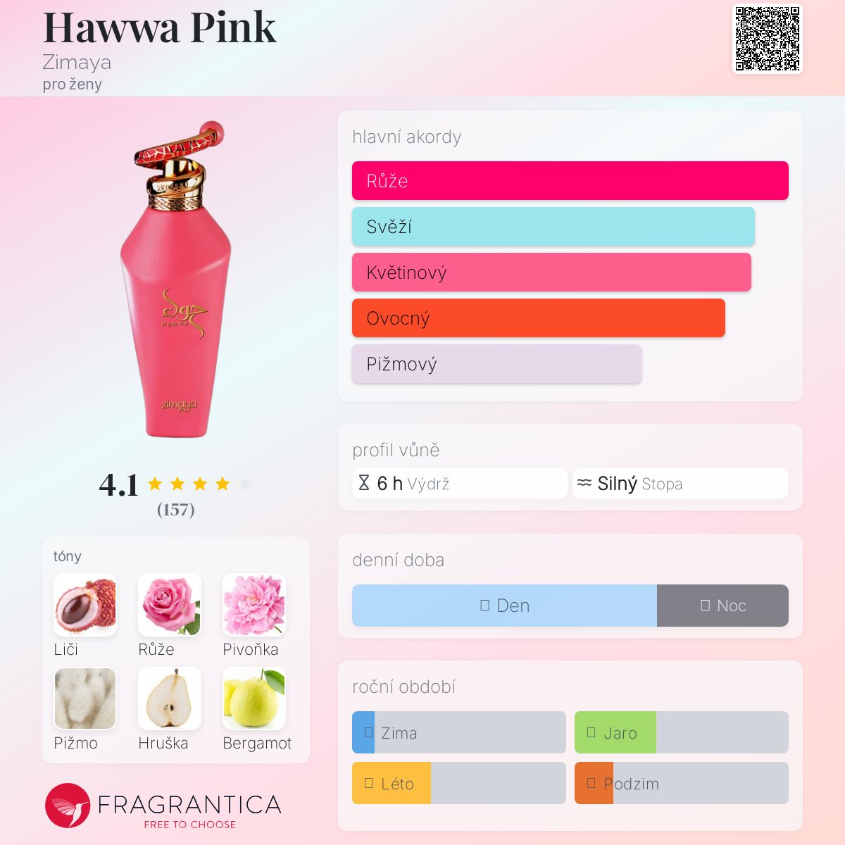 Hawwa Pink podle Zimaya je Floral Fruity vůně pro ženy. Toto je nová vůně. Hawwa Pink byl/a uveden/a v roce 2024. Vrchní tóny jsou Liči, Růže, Hruška a Bergamot; střední tóny jsouTurecká růže a Pivoňka ; základní tóny jsou Bílé pižmo, Haitský vetiver a Dřevité tóny.