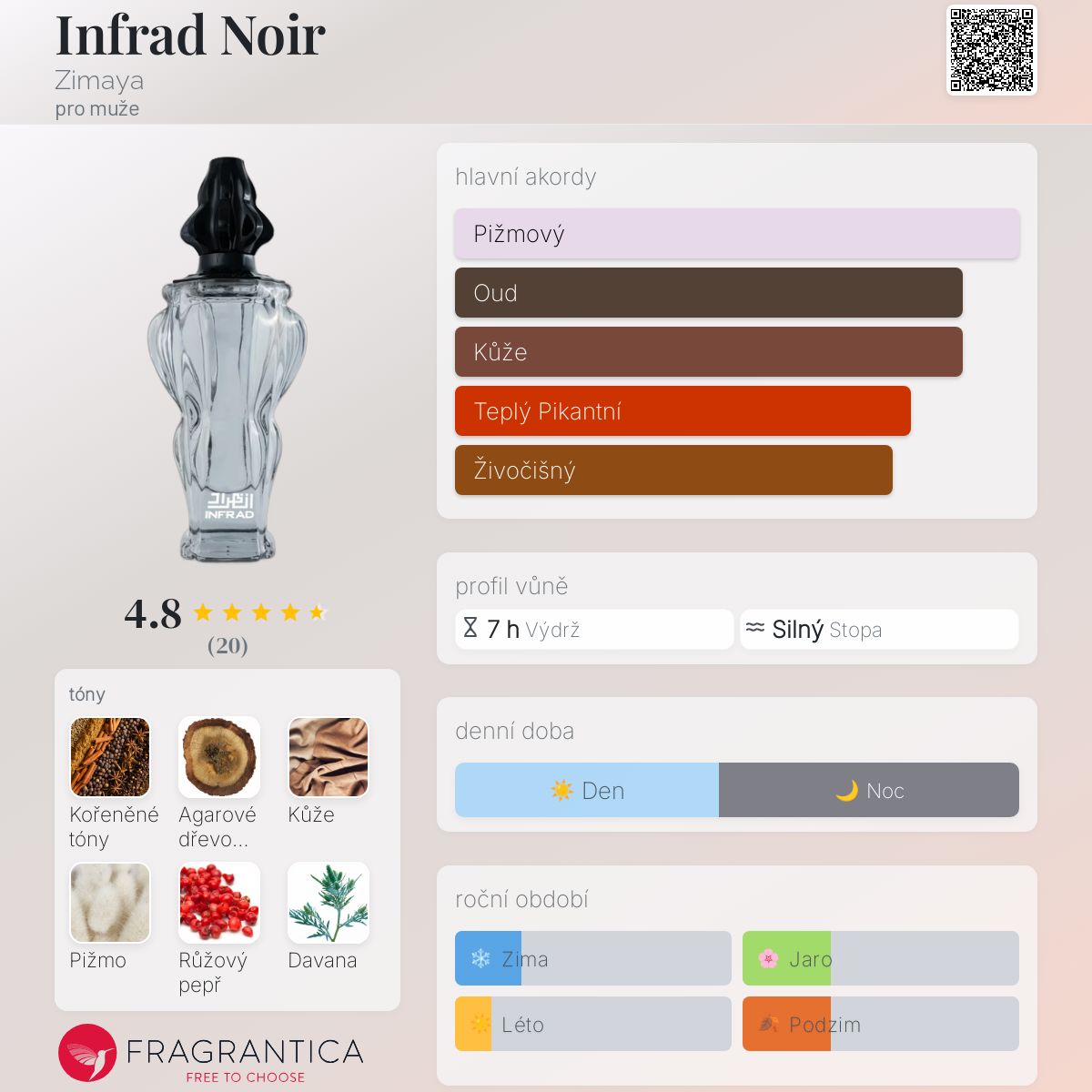 Infrad Noir podle Zimaya je Orientální Woody vůně pro muže. Toto je nová vůně. Infrad Noir byl/a uveden/a v roce 2024. "Nosem" za touto vůní je Imran Fazlani. Vrchní tóny jsou Růžový pepř, Bergamot a Mandarinka; střední tóny jsouAgarové dřevo (oud), Davana a Jantar (ambra) ; základní tóny jsou Koření, Kůže a Pižmo.