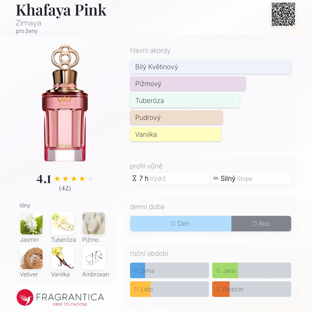 Khafaya Pink podle Zimaya je Floral vůně pro ženy. Khafaya Pink byl/a uveden/a v roce 2023. Vrchní tóny jsou Vanilka, Bergamot a Hruška; střední tóny jsouJasmín, Indická tuberóza a Pomeranč ; základní tóny jsou Pižmo, Vetiver a Ambroxan.