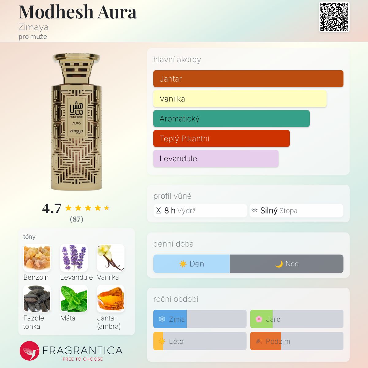Modhesh Aura podle Zimaya je Orientální Woody vůně pro muže. Toto je nová vůně. Modhesh Aura byl/a uveden/a v roce 2025. "Nosem" za touto vůní je Imran Fazlani. Vrchní tóny jsou Levandule, Máta, Dřevité tóny a Bergamot; střední tóny jsouBenzoin, Jantar (ambra), Kardamom a Ananas ; základní tóny jsou Vanilka, Fazole tonka a Pižmo.