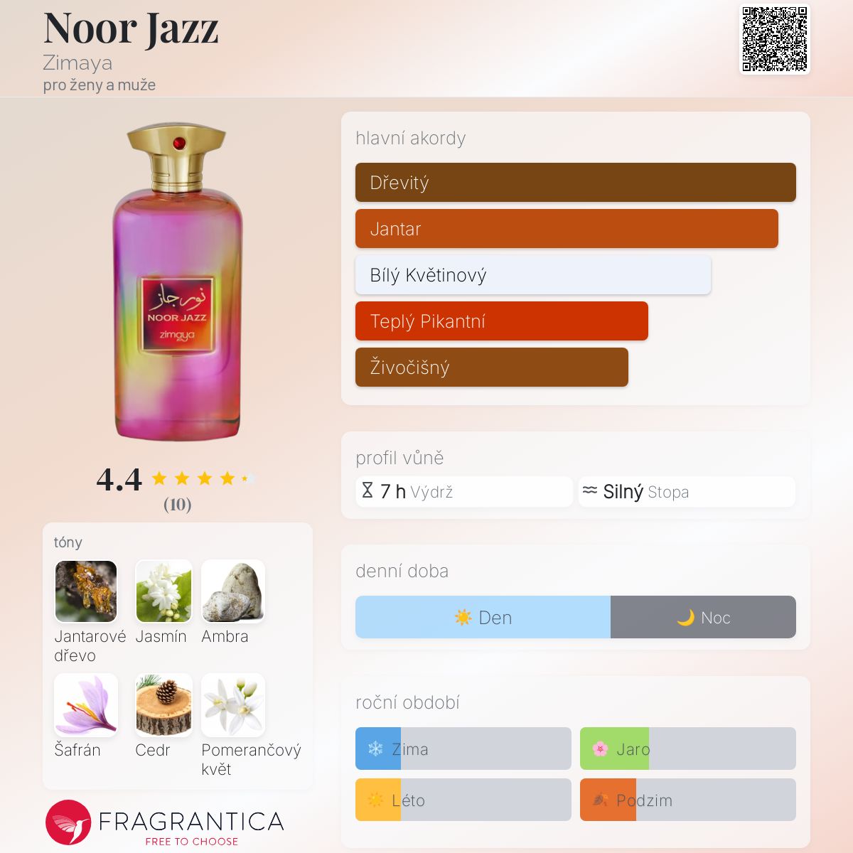 Noor Jazz podle Zimaya je Orientální Floral vůně pro ženy a muže. Toto je nová vůně. Noor Jazz byl/a uveden/a v roce 2024. Vrchní tóny jsou Jantarové dřevo, Jasmín a Šafrán; střední tóny jsouAmbra, Cedr a Pomerančový květ ; základní tóny jsou Dřevité tóny a Pižmo.