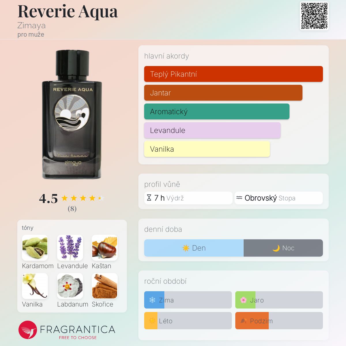 Reverie Aqua podle Zimaya je Orientální Spicy vůně pro muže. Toto je nová vůně. Reverie Aqua byl/a uveden/a v roce 2025. Vrchní tóny jsou Kardamom, Skořice a Bazalka; střední tóny jsouLevandule, Kaštan a Vanilka ; základní tóny jsou Labdanum, Jantar (ambra), Pižmo a Vetiver.
