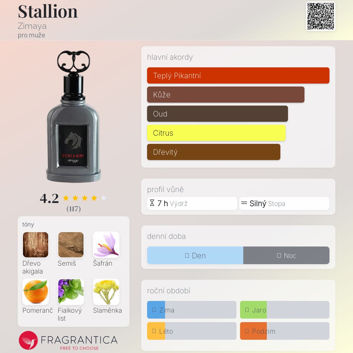 Stallion podle Zimaya je Woody Aromatic vůně pro muže. Stallion byl/a uveden/a v roce 2023. "Nosem" za touto vůní je Imran Fazlani. Vrchní tóny jsou Šafrán, Pomeranč a Fialkový list; střední tóny jsouDřevo akigala a Jantar (ambra) ; základní tóny jsou Semiš a Slaměnka.