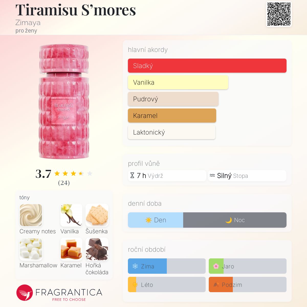 Tiramisu S’mores podle Zimaya je Orientální Vanilla vůně pro ženy. Toto je nová vůně. Tiramisu S’mores byl/a uveden/a v roce 2025. Vrchní tóny jsou Čokoláda, Marshmallow, Káva, Nektarinkový květ a Bergamot; střední tóny jsouSušenka, Vanilka, Mandle, Mléko a Pižmo ; základní tóny jsou Krémové tóny, Cukr, Karamel, Jantar (ambra) a Pižmo.