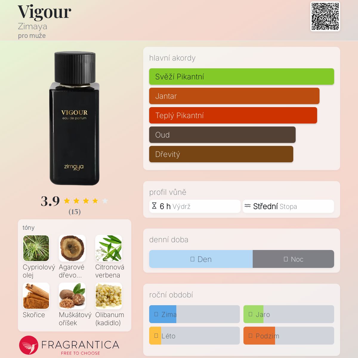 Vigour podle Zimaya je Woody Spicy vůně pro muže. Vigour byl/a uveden/a v roce 2023. Vrchní tóny jsou Citronová verbena, Skořice, Muškátový oříšek a Bergamot; střední tóny jsouCypriolový olej, Olibanum, Šafrán a Červené jablko ; základní tóny jsou Agarové dřevo (oud), Ambra a Levandule.