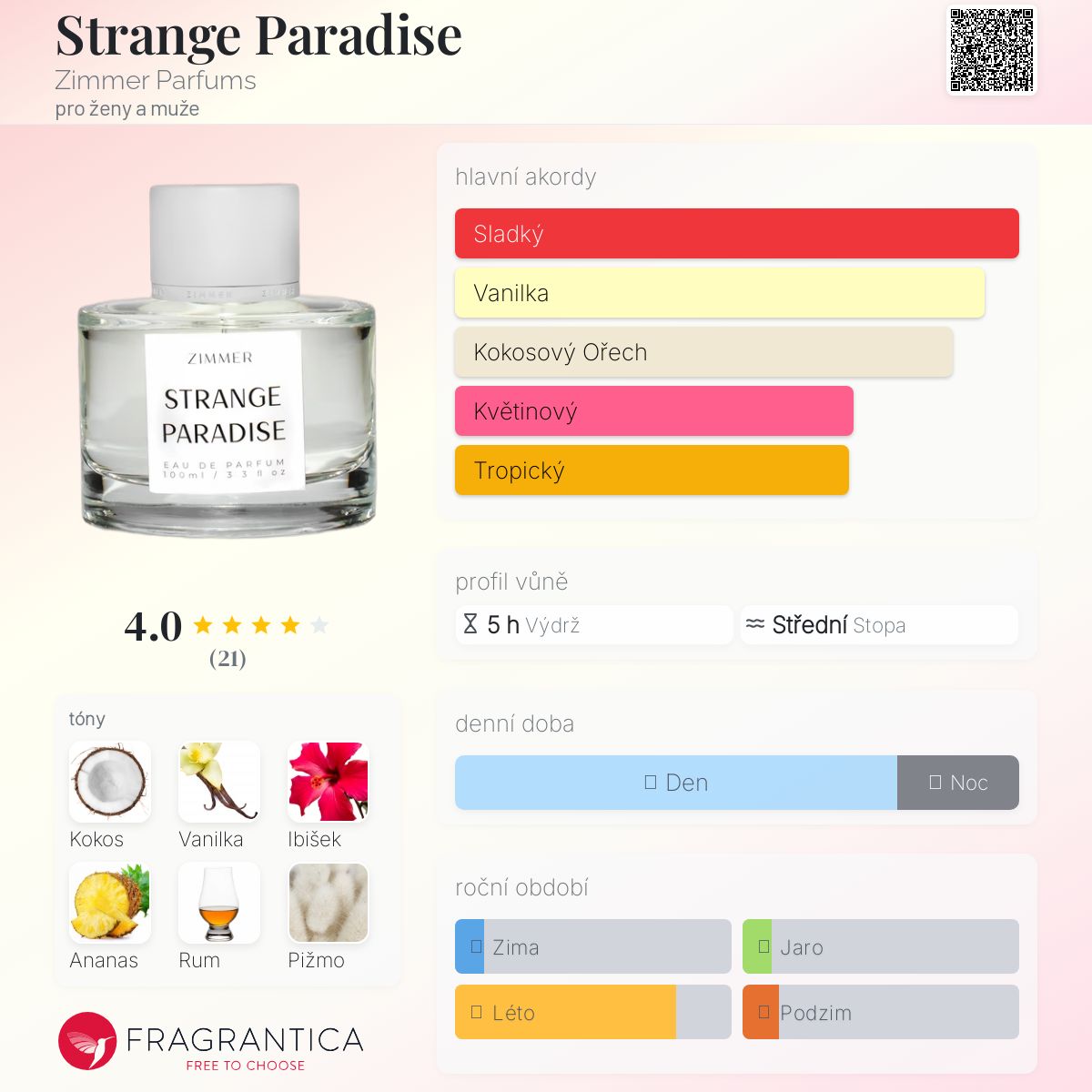 Strange Paradise podle Zimmer Parfums je vůně pro ženy a muže. Toto je nová vůně. Strange Paradise byl/a uveden/a v roce 2022. Vrchní tóny jsou Kokos, Ananas a Jasmín; střední tóny jsouVanilka, Ibišek a Ylang-Ylang ; základní tóny jsou Bílý rum, Pižmo a Zázvor.