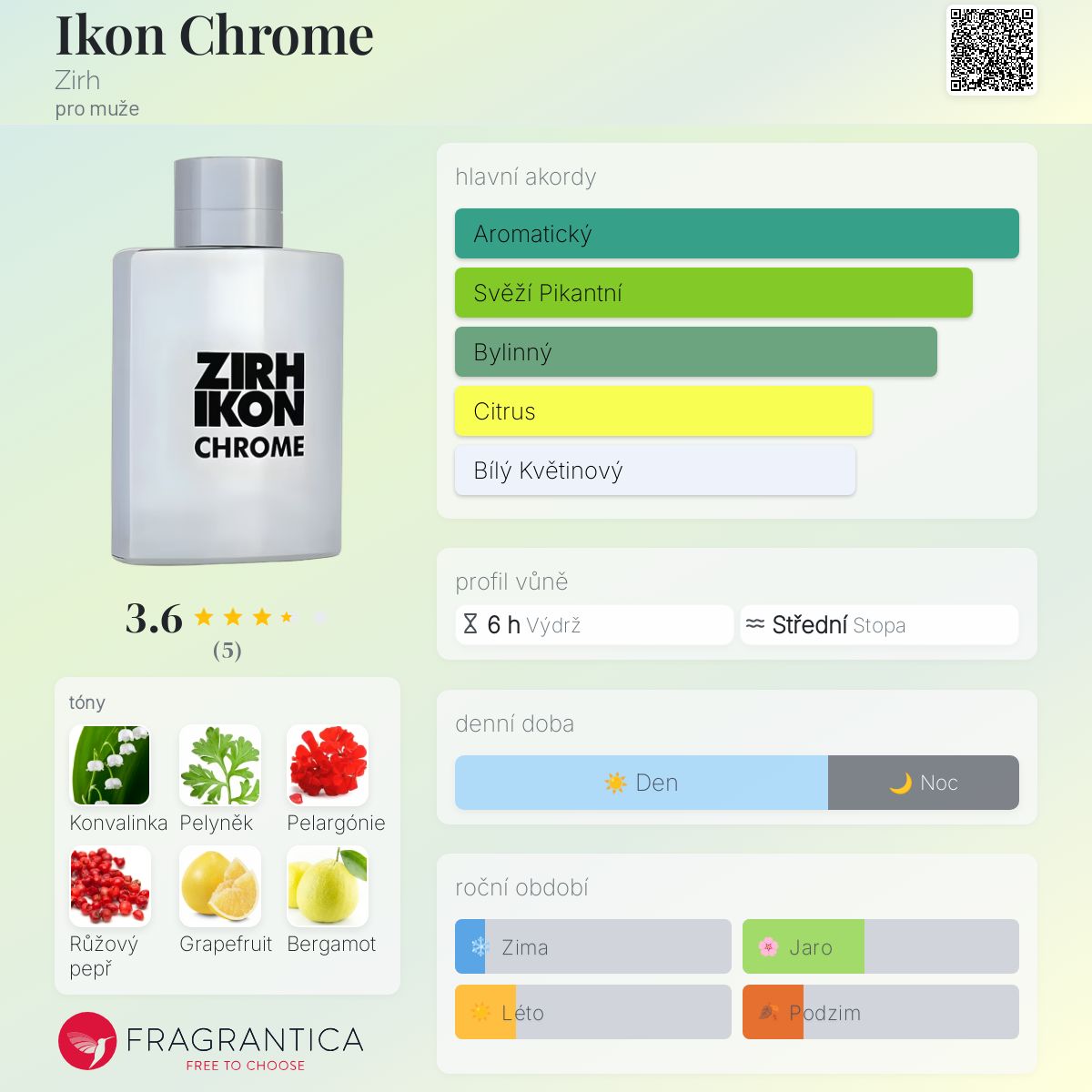 Ikon Chrome podle Zirh je Chypre vůně pro muže. Ikon Chrome byla spuštěna během 2020. Vrchní tóny jsou Růžový pepř, Grapefruit, Bergamot a Citrón; střední tóny jsouKonvalinka, Pelyněk, Pelargónie a Zázvor ; základní tóny jsou Cedr, Vetiver, Jantar (ambra), Mech a Pižmo.