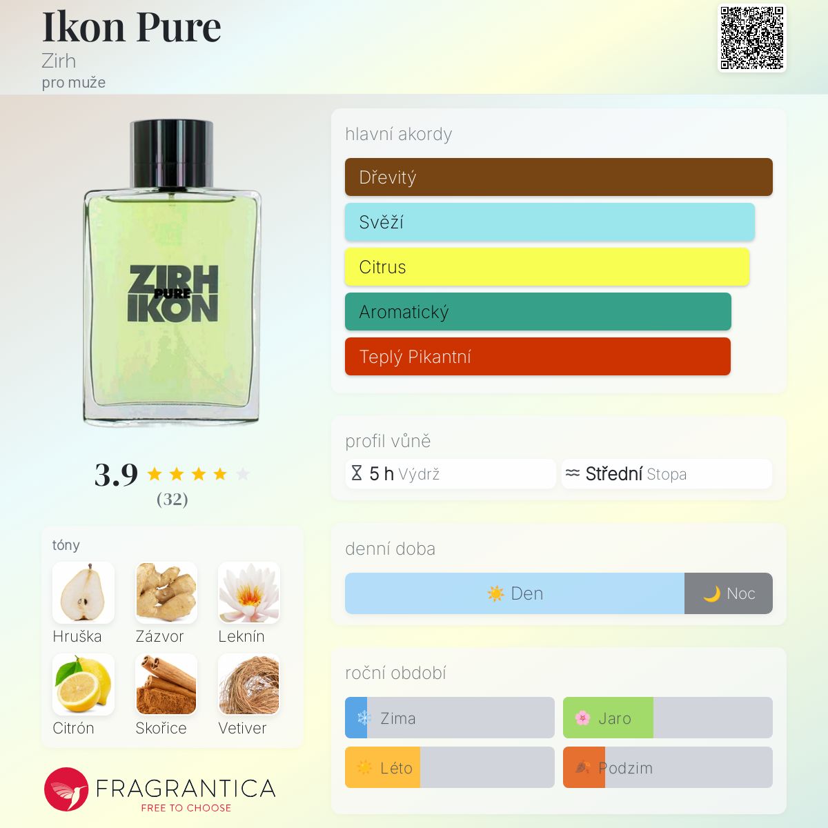 Ikon Pure podle Zirh je Aromatic vůně pro muže. Ikon Pure byl/a uveden/a v roce 2012. Vrchní tóny jsou Hruška, Zázvor, Citrón, Limetka, Kardamom a Pelyněk; střední tóny jsouLeknín, Skořice, Břečťan, Kosatec a Labdanum ; základní tóny jsou Vetiver, Cedr, Ambra, Olibanum a Pačuli.