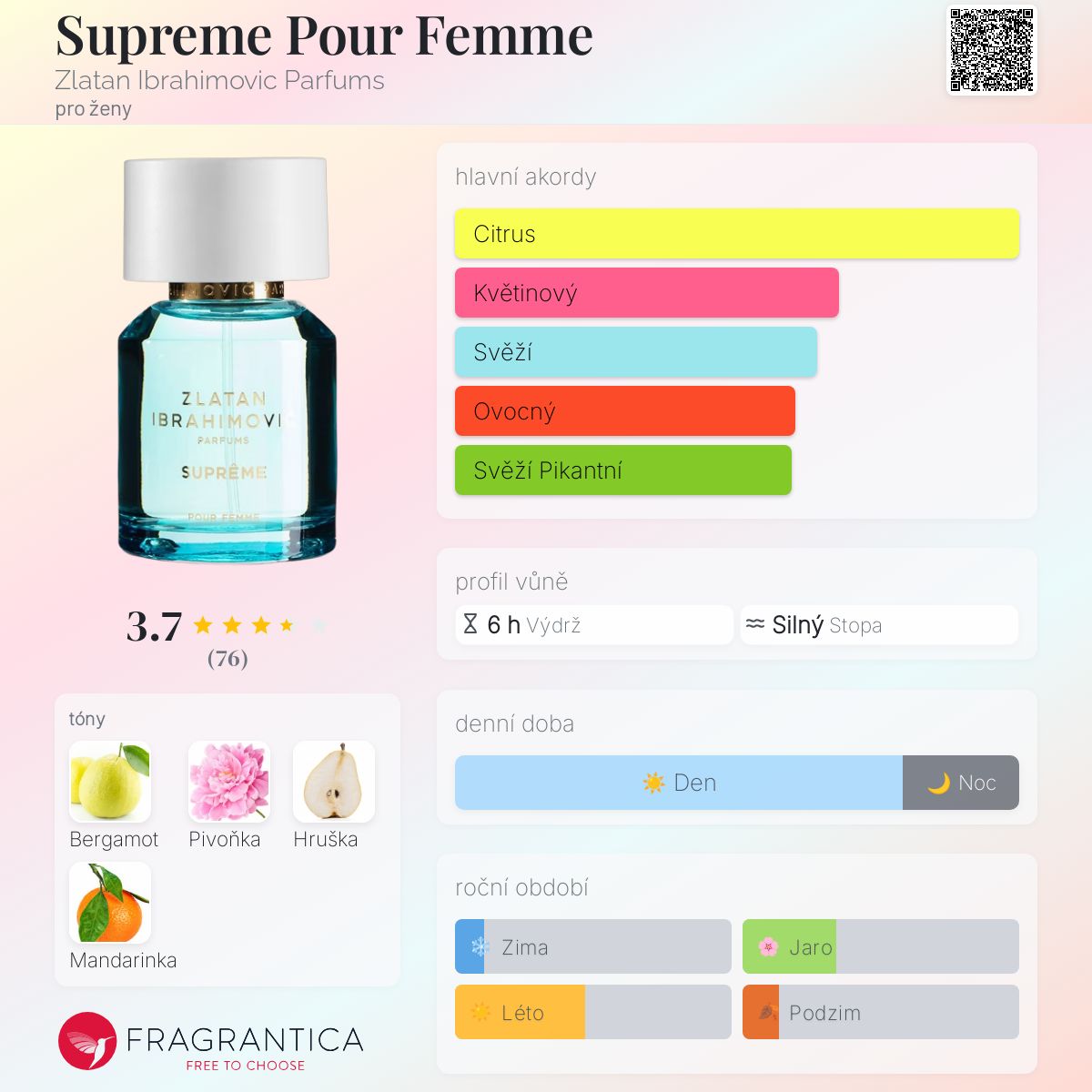 Supreme Pour Femme podle Zlatan Ibrahimovic Parfums je Floral Fruity vůně pro ženy. Supreme Pour Femme byl/a uveden/a v roce 2016. "Nosem" za touto vůní je Olivier Pescheux.