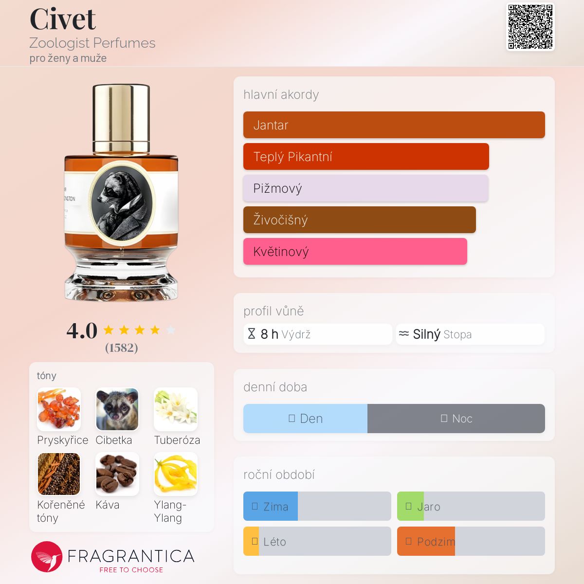 Civet podle Zoologist Perfumes je Aromatic vůně pro ženy a muže. Civet byl/a uveden/a v roce 2016. "Nosem" za touto vůní je Shelley Waddington.