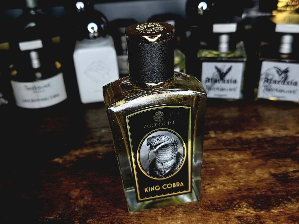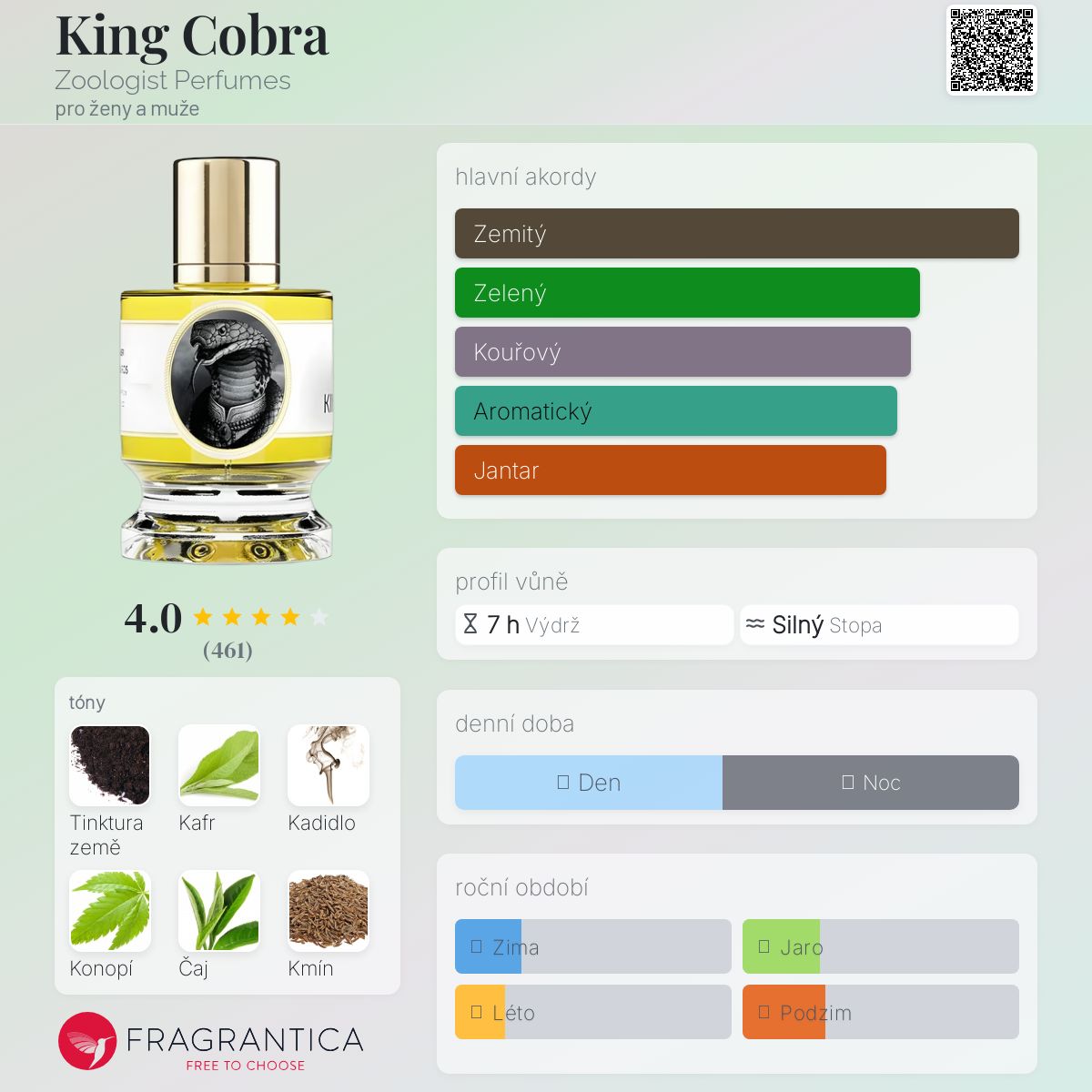 King Cobra podle Zoologist Perfumes je Woody Aromatic vůně pro ženy a muže. Toto je nová vůně. King Cobra byl/a uveden/a v roce 2024. "Nosem" za touto vůní je Prin Lomros. Vrchní tóny jsou Kafr, Konopí, Pomelo, Petitgrain, Fíkový list a Mandarinka; střední tóny jsouPůdní tinktura, Černý čaj, Kmín a Kůže ; základní tóny jsou Kadidlo, Mech, Vetiver, Pačuli a Jantar (ambra).