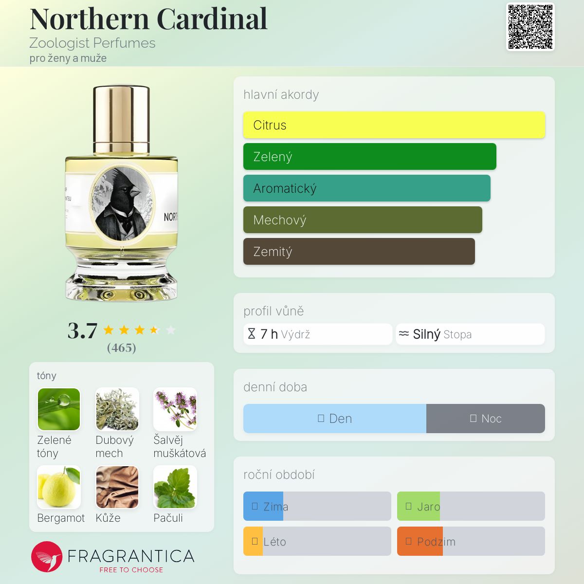 Northern Cardinal podle Zoologist Perfumes je Chypre vůně pro ženy a muže. Northern Cardinal byl/a uveden/a v roce 2022. "Nosem" za touto vůní je Rosendo Mateu. Vrchní tóny jsou Zelené listí, Bergamot, Citrón a Mandarinka; střední tóny jsouŠalvěj muškátová, Kůže a Růže ; základní tóny jsou Dubový mech, Pačuli, Vanilka a Pižmo.