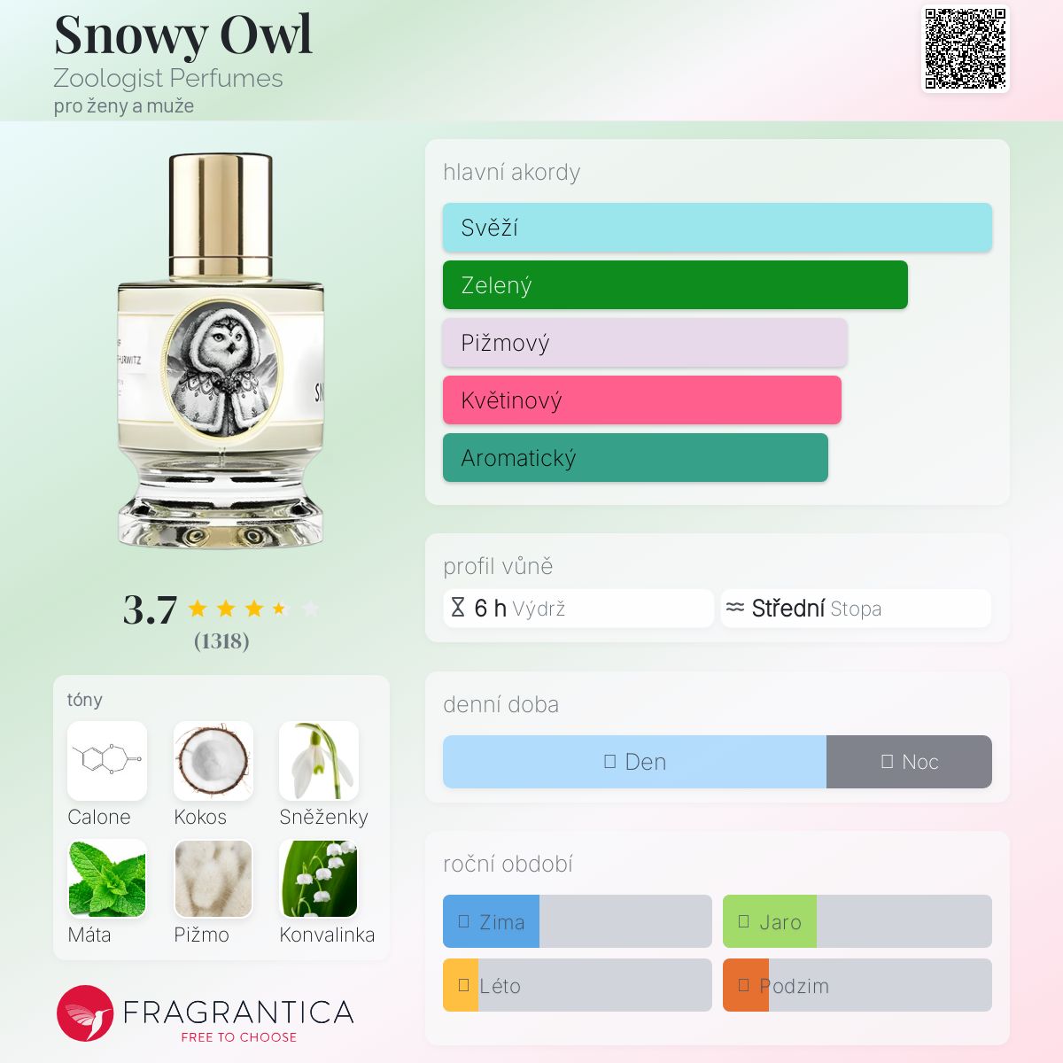 Snowy Owl podle Zoologist Perfumes je Floral Woody Musk vůně pro ženy a muže. Snowy Owl byl/a uveden/a v roce 2020. "Nosem" za touto vůní je Dawn Spencer Hurwitz. Vrchní tóny jsou Calone, Kokos, Máta a Konvalinka; střední tóny jsouSněženky, Kosatec, Maté, Galbanum, Olibanum a Bílá růže ; základní tóny jsou Pižmo, Vanilka, Dubový mech, Ambrette (přírodní pižmo), Syntetická cibetka, Cedr a Fazole tonka.