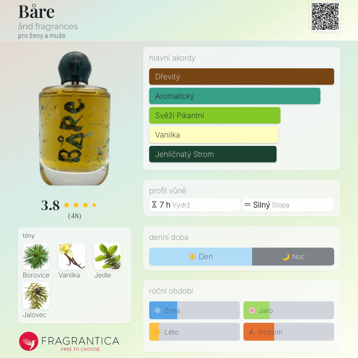 Båre podle ånd fragrances je vůně pro ženy a muže. Båre byl/a uveden/a v roce 2021. "Nosem" za touto vůní je Simon Constantine. Vrchní tón je Borovice ; střední tóny jsouJedle a Červený cedr ; základní tón je Vanilka.