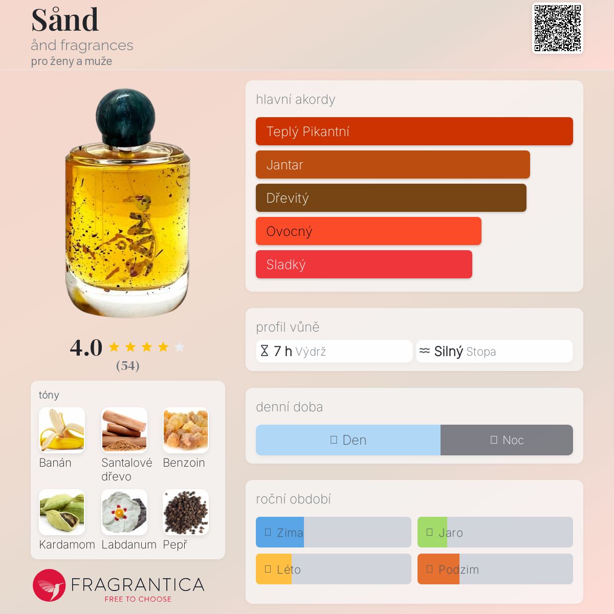 Sånd podle ånd fragrances je Orientální Spicy vůně pro ženy a muže. Sånd byl/a uveden/a v roce 2020. "Nosem" za touto vůní je Simon Constantine. Vrchní tón je Banán ; střední tóny jsouKardamom a Černý pepř ; základní tóny jsou Australské santalové dřevo, Benzoin a Labdanum.