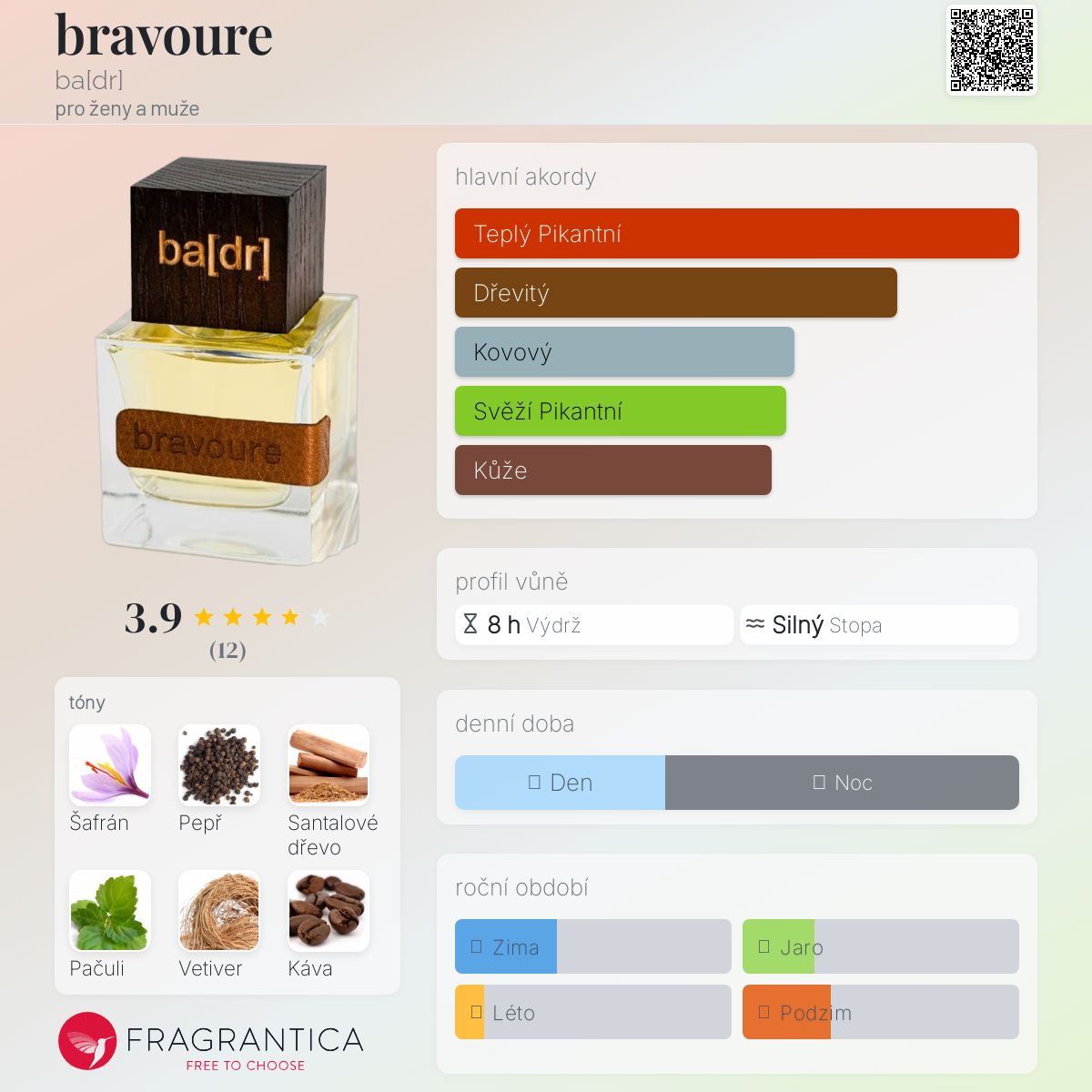 bravoure podle ba[dr] je Orientální Woody vůně pro ženy a muže. Toto je nová vůně. bravoure byl/a uveden/a v roce 2024. Vrchní tóny jsou Šafrán, Černý pepř a Bergamot; střední tóny jsouSantalové dřevo, Vetiver, Káva a Agarové dřevo (oud) ; základní tóny jsou Pačuli, Labdanum, Cedr, Jantar (ambra) a Pižmo.