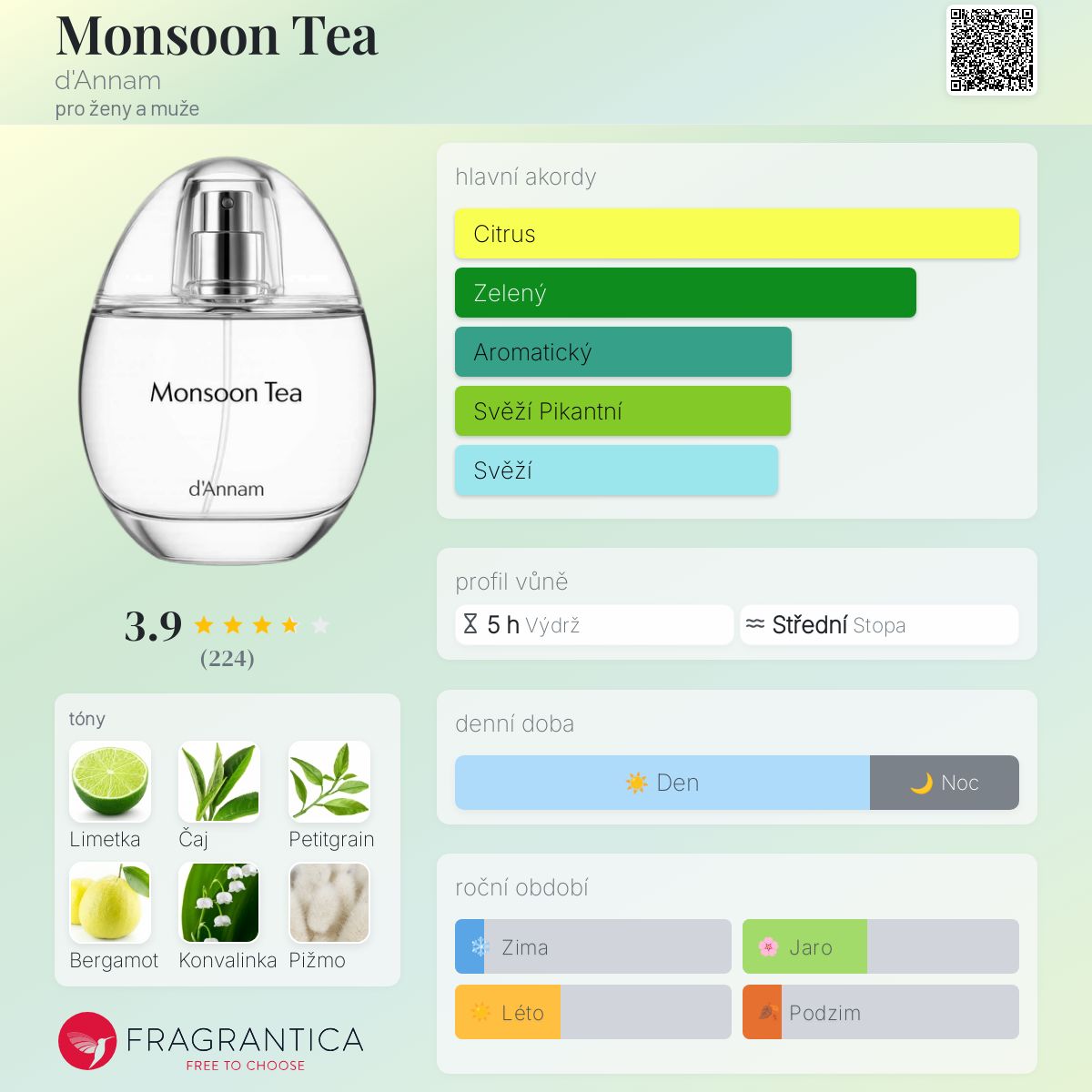 Monsoon Tea podle d'Annam je Orientální vůně pro ženy a muže. Monsoon Tea byl/a uveden/a v roce 2023. Monsoon Tea byl/a vytvořen/a Anh Ngo a IFF. Vrchní tóny jsou Limetka, Petitgrain a Bergamot; střední tóny jsouZelený čaj a Konvalinka ; základní tóny jsou Pižmo, Jantar (ambra) a Vetiver.