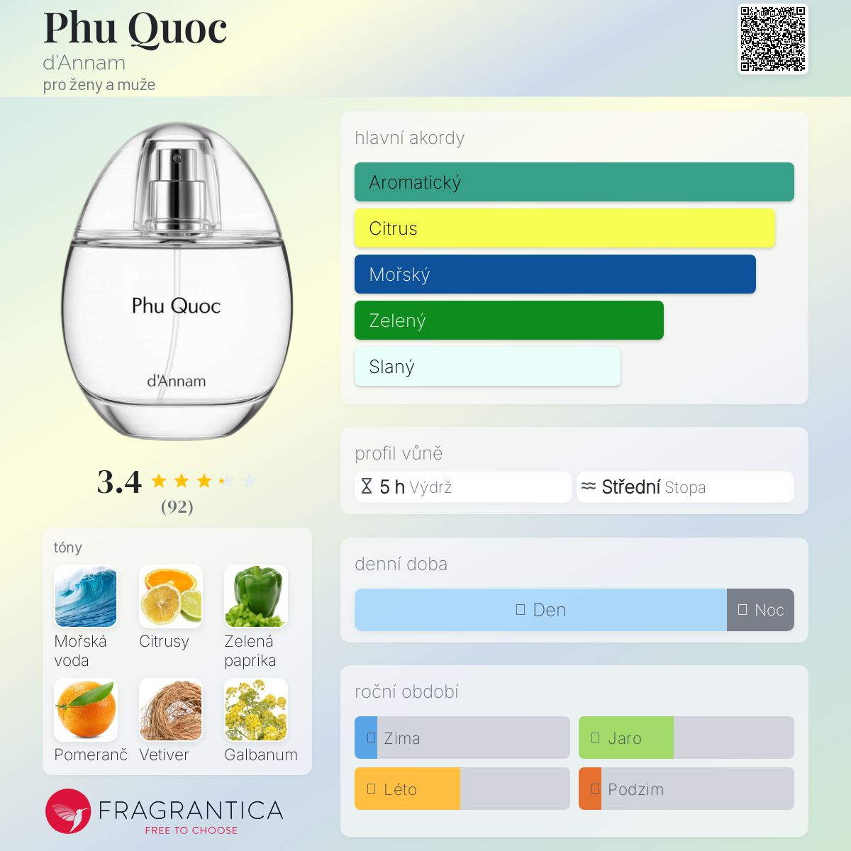 Phu Quoc podle d'Annam je Orientální Woody vůně pro ženy a muže. Phu Quoc byl/a uveden/a v roce 2023. Phu Quoc byl/a vytvořen/a Anh Ngo a IFF. Vrchní tóny jsou Citrusy, Zelená paprika a Galbanum; střední tóny jsouMořské tóny, Pomeranč a Konvalinka ; základní tóny jsou Vetiver, Cedr a Jantar (ambra).