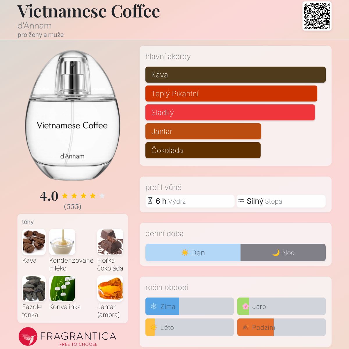 Vietnamese Coffee podle d'Annam je Aromatic vůně pro ženy a muže. Vietnamese Coffee byl/a uveden/a v roce 2023. Vietnamese Coffee byl/a vytvořen/a Anh Ngo a IFF. Vrchní tón je Káva ; střední tóny jsouKondenzované mléko, Hořká čokoláda a Konvalinka ; základní tóny jsou Fazole tonka, Cedr a Jantar (ambra).