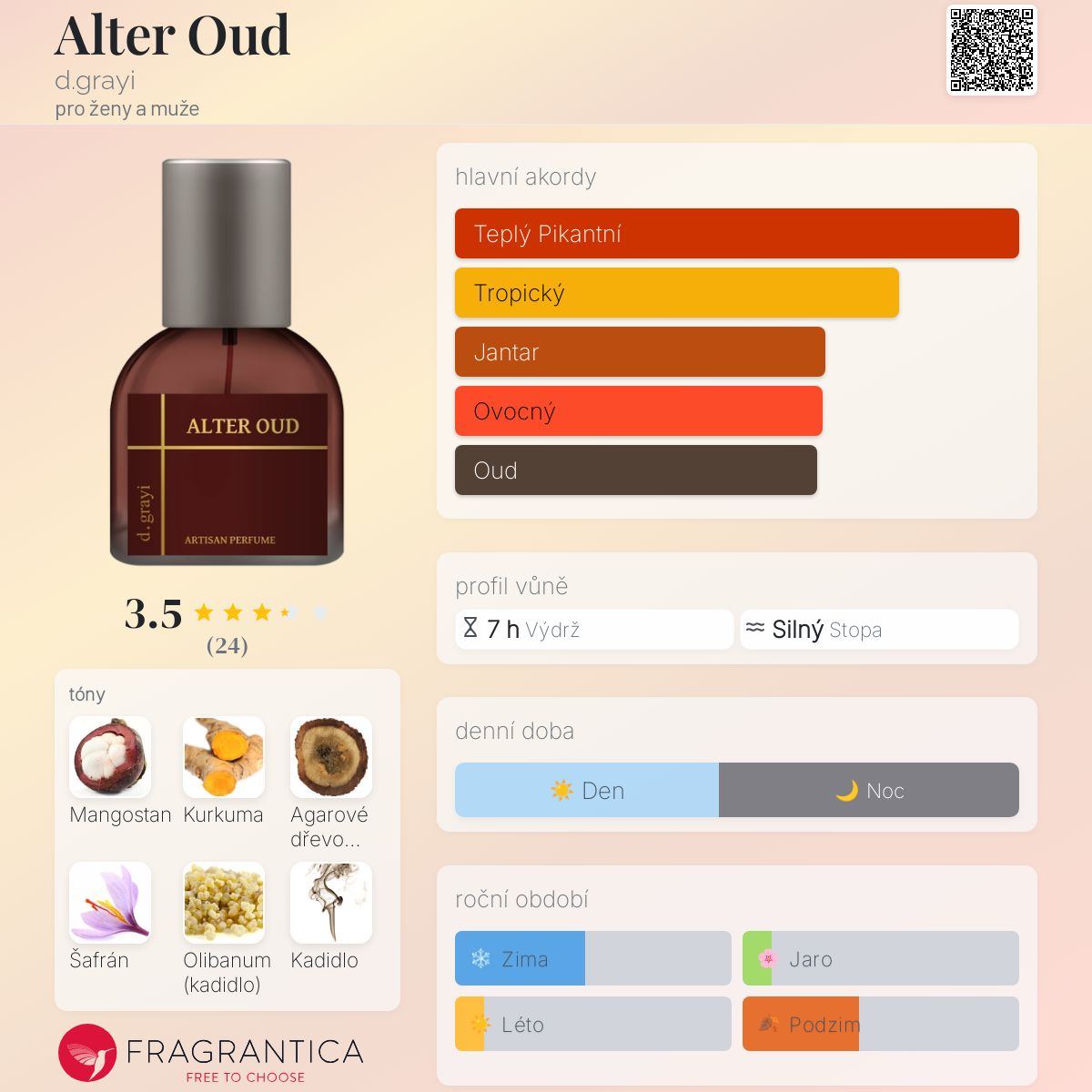 Alter Oud podle d.grayi je Orientální Woody vůně pro ženy a muže. Alter Oud byl/a uveden/a v roce 2022. "Nosem" za touto vůní je James Nguyen. Vrchní tóny jsou Mangostan, Šafrán a Kadidlo; střední tóny jsouKadidlo, Rýže, Koření a Sušené ovoce ; základní tóny jsou Kurkuma a Agarové dřevo (oud) a Agarové dřevo (oud).