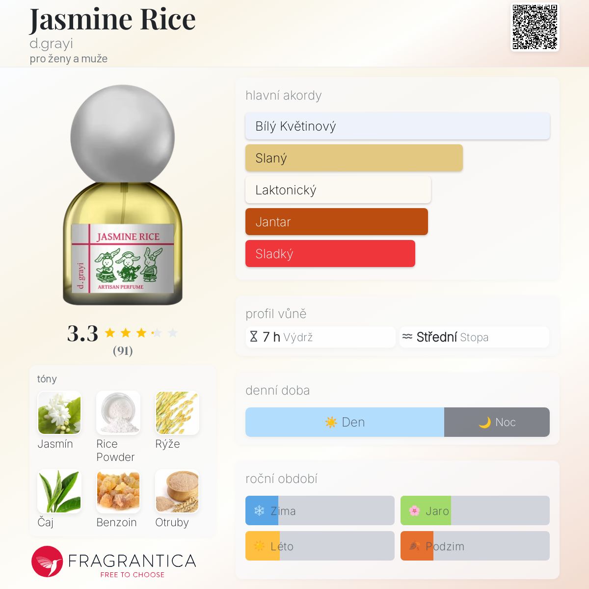 Jasmine Rice podle d.grayi je vůně pro ženy a muže. Jasmine Rice byla spuštěna během 2020. Vrchní tóny jsou Jasmín, Rýže a Černý čaj; střední tóny jsouJasmín Sambac a Rýžový pudr ; základní tóny jsou Rýže, Benzoin a Otruby.