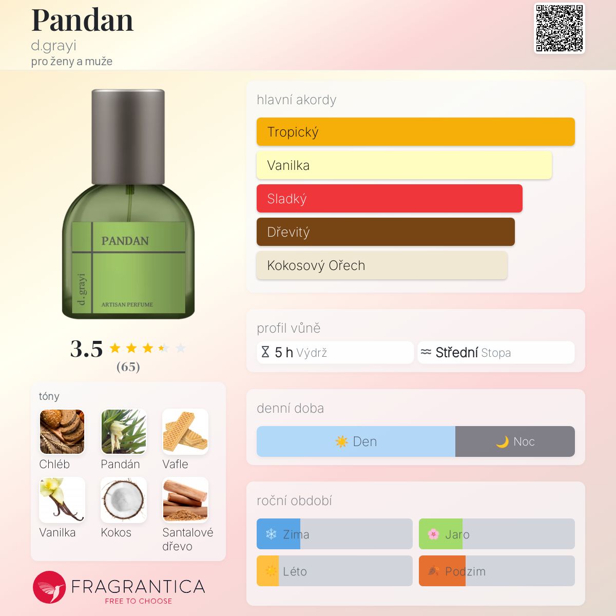 Pandan podle d.grayi je Orientální Vanilla vůně pro ženy a muže. Pandan byl/a uveden/a v roce 2023. "Nosem" za touto vůní je James Nguyen. Vrchní tóny jsou Chléb a Kokosové mléko; střední tóny jsouPandán a Santalové dřevo ; základní tóny jsou Vafle, Vanilka a Borovice.
