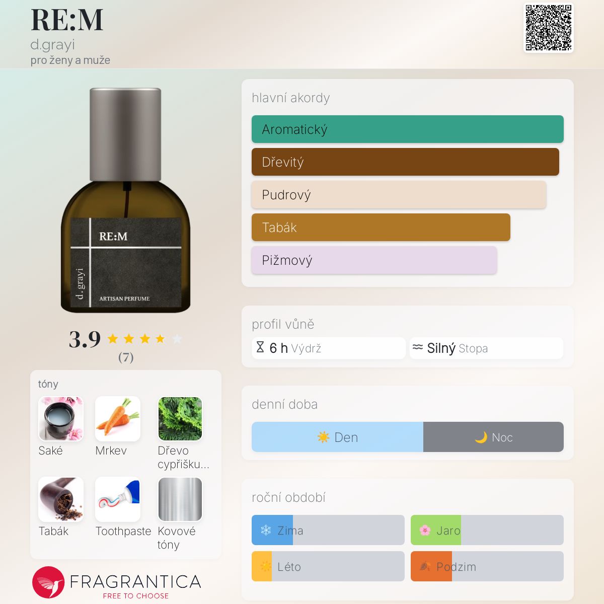 RE:M podle d.grayi je Aromatic Green vůně pro ženy a muže. RE:M byl/a uveden/a v roce 2022. "Nosem" za touto vůní je James Nguyen. Vrchní tóny jsou Saké, Zubní pasta, Kovové tóny a Yuzu; střední tóny jsouMrkev, Čaj a Jasmín ; základní tóny jsou Dřevo cypřišku tupolistého, Tabák, Bílé pižmo a Dubový mech.