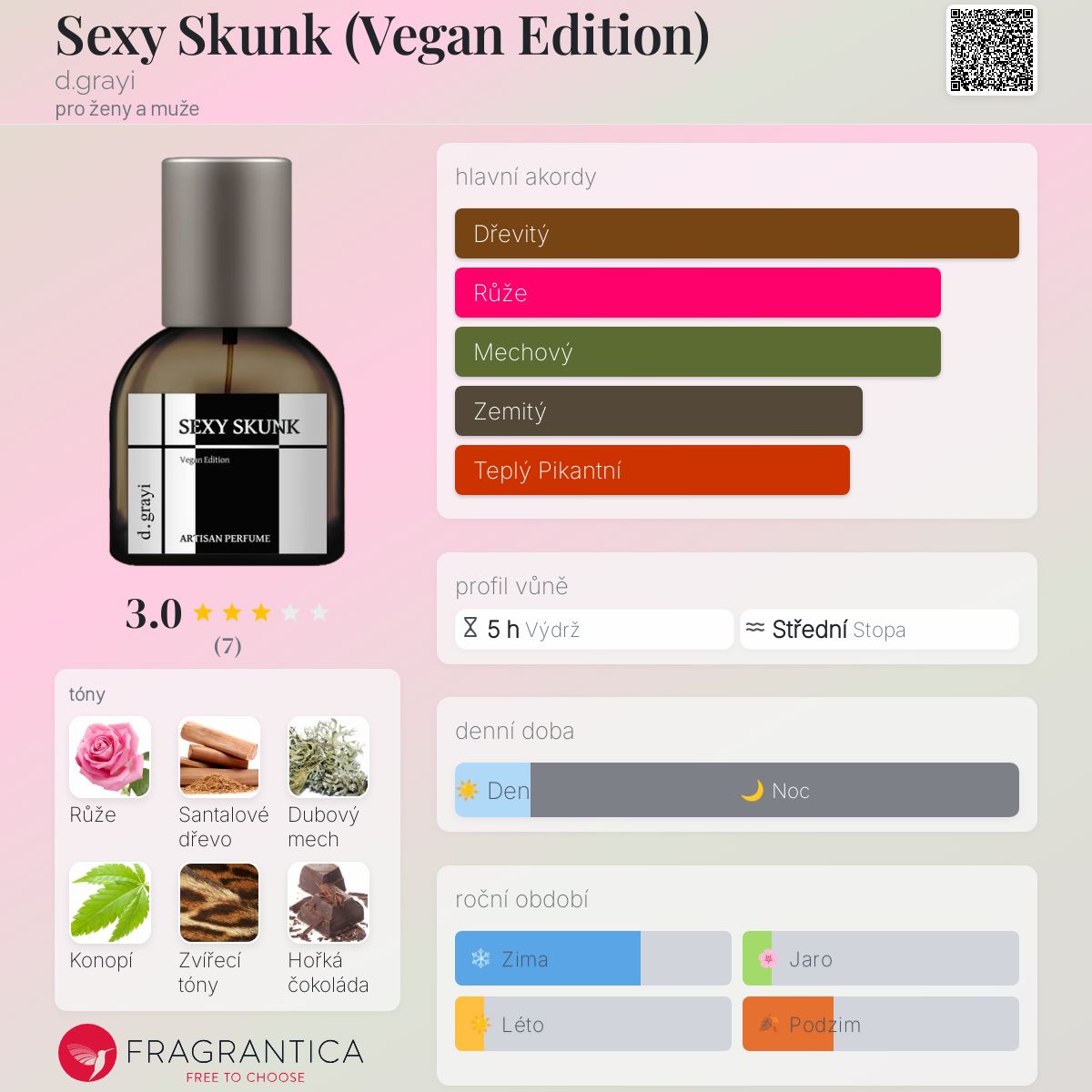 Sexy Skunk (Vegan Edition) podle d.grayi je Aromatic vůně pro ženy a muže. Sexy Skunk (Vegan Edition) byl/a uveden/a v roce 2023. "Nosem" za touto vůní je James Nguyen. Vrchní tóny jsou Růže a Konopí; střední tóny jsouZvířecí tóny a Čokoláda ; základní tóny jsou Santalové dřevo, Dubový mech a Jantar (ambra).