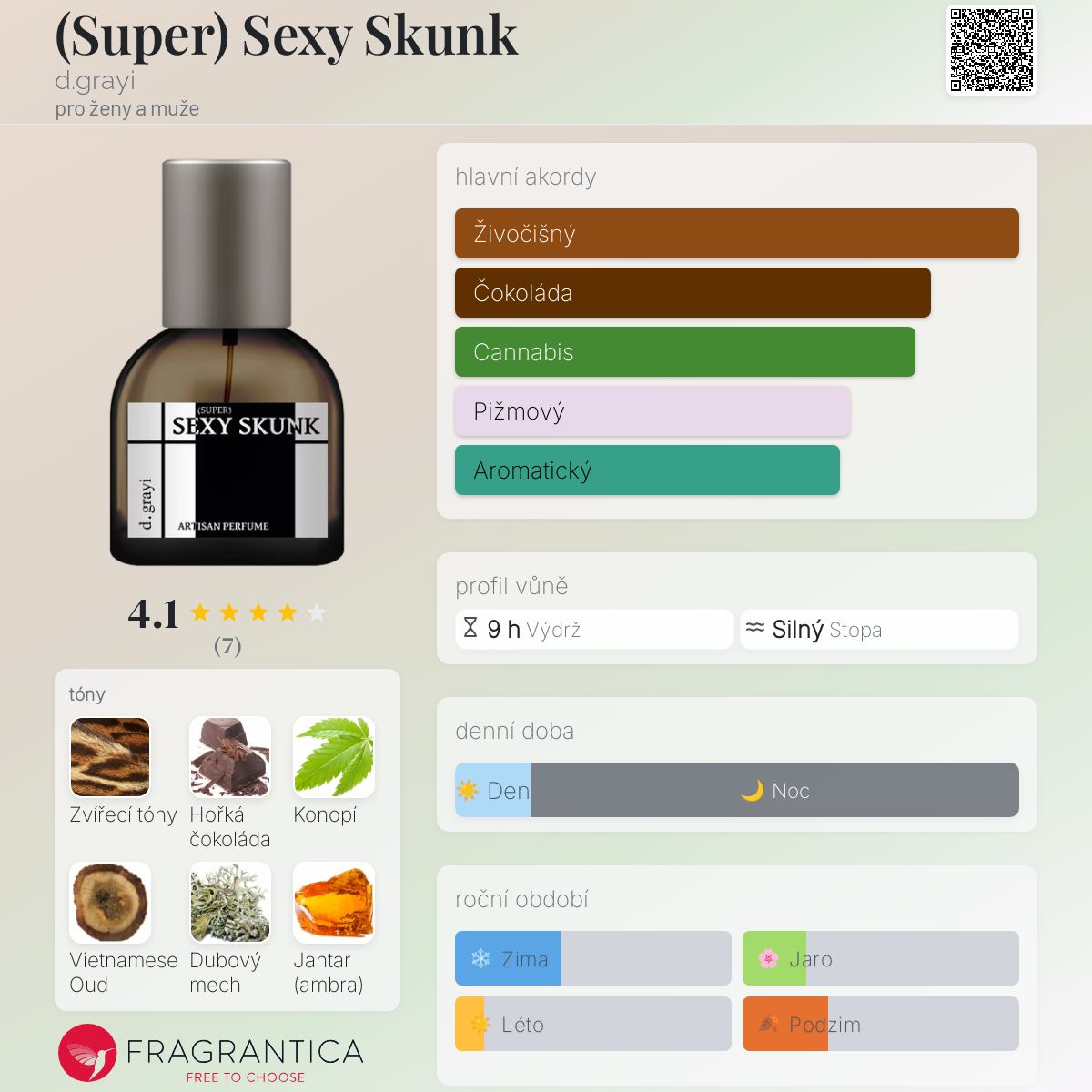 (Super) Sexy Skunk podle d.grayi je Orientální Spicy vůně pro ženy a muže. Toto je nová vůně. (Super) Sexy Skunk byl/a uveden/a v roce 2024. "Nosem" za touto vůní je James Nguyen. Vrchní tóny jsou Konopí a Růže; střední tóny jsouZvířecí tóny, Čokoláda a Vietnamský oud ; základní tóny jsou Dubový mech, Jantar (ambra) a Santalové dřevo.