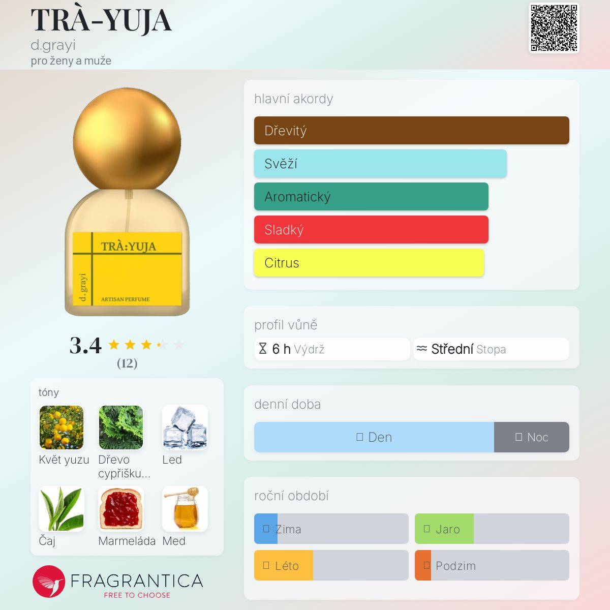 TRÀ-YUJA podle d.grayi je Citrus Aromatic vůně pro ženy a muže. TRÀ-YUJA byl/a uveden/a v roce 2023. "Nosem" za touto vůní je James Nguyen. Vrchní tóny jsou Led a Čaj; střední tóny jsouKvět yuzu, Dřevo cypřišku tupolistého a Cedr ; základní tóny jsou Marmeláda, Med, Pyl a Borovice.