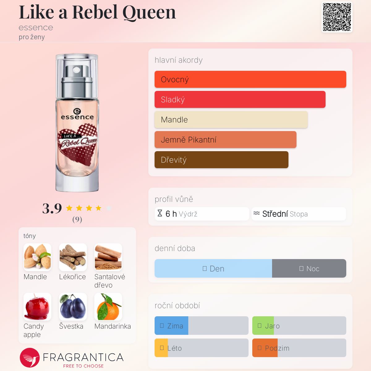 Like a Rebel Queen podle essence je Aromatic Fruity vůně pro ženy. Like a Rebel Queen byl/a uveden/a v roce 2016. Vrchní tóny jsou Sladké jablko, Mandarinka a Hruška; střední tóny jsouMandle a Švestka ; základní tóny jsou Lékořice, Santalové dřevo a Pižmo.