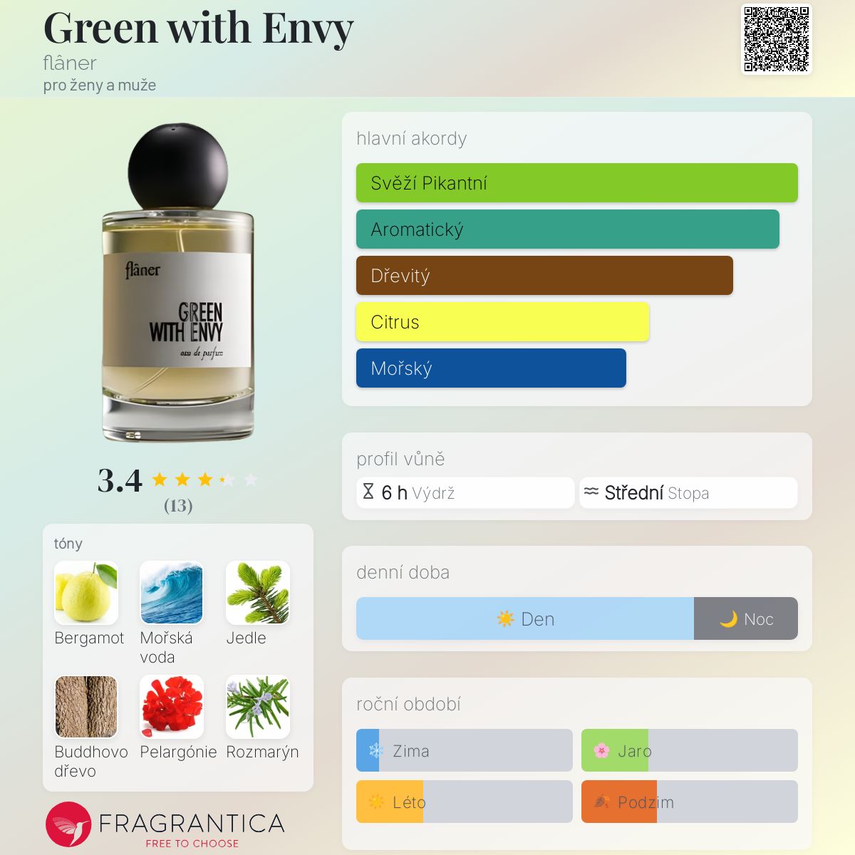 Green with Envy podle flâner je Aromatic Aquatic vůně pro ženy a muže. Green with Envy byl/a uveden/a v roce 2023. "Nosem" za touto vůní je Ivan Alemany. Vrchní tóny jsou Bergamot, Rozmarýn a Mandarinka; střední tóny jsouMořská voda, Pelargónie, Černý pepř a Fialka ; základní tóny jsou Jedle, Buddhovo dřevo, Bílé pižmo a Jantar (ambra).