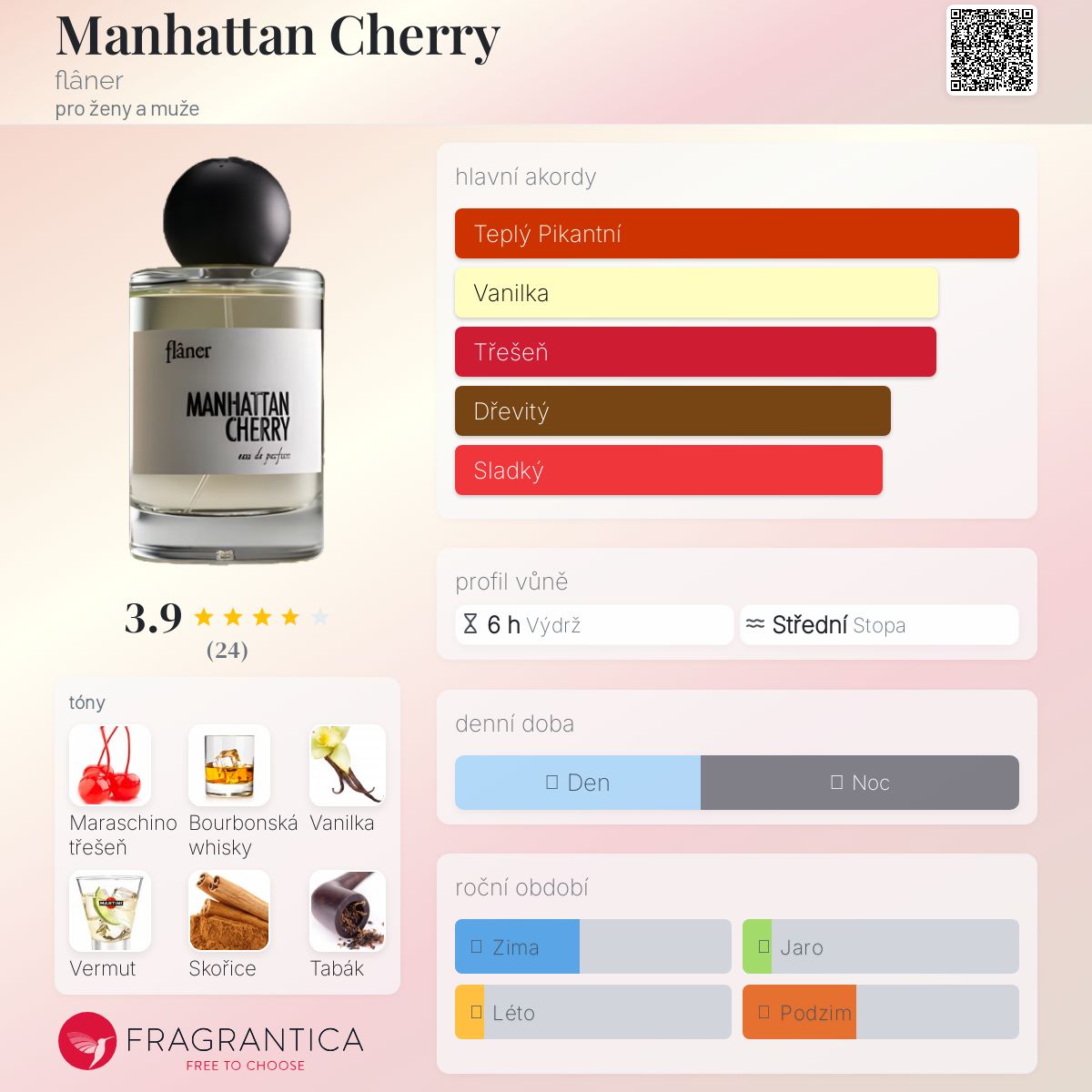 Manhattan Cherry podle flâner je Orientální Vanilla vůně pro ženy a muže. Manhattan Cherry byl/a uveden/a v roce 2023. "Nosem" za touto vůní je Ivan Alemany. Vrchní tóny jsou Maraschino třešeň, Vermut a Pomerančová slupka; střední tóny jsouBourbonská whisky, Skořice a Zázvor ; základní tóny jsou Vanilka, Tabák, Kůže a Jantarové dřevo.