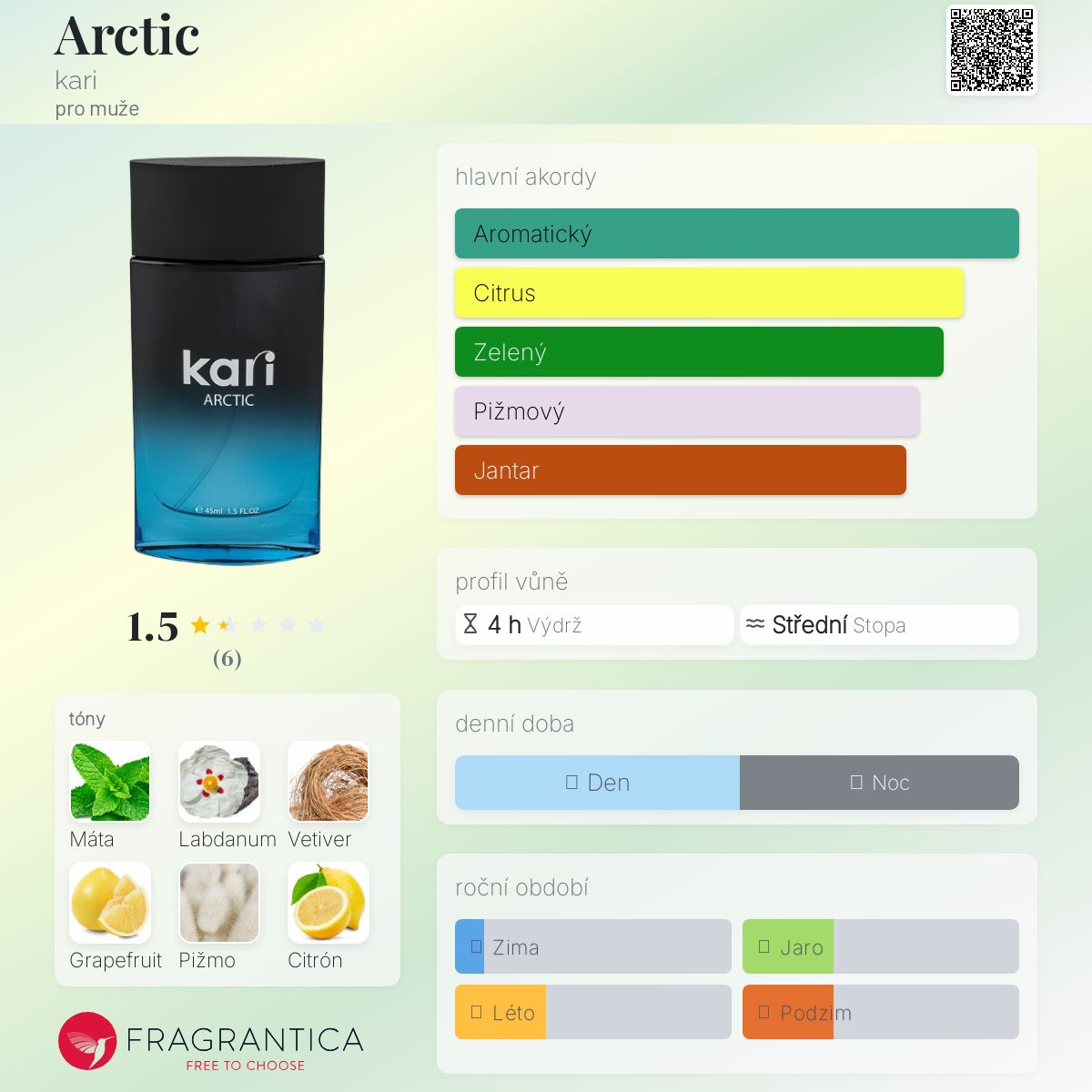 Arctic podle kari je Woody Aromatic vůně pro muže. Arctic byl/a uveden/a v roce 2022. Vrchní tóny jsou Máta, Grapefruit, Citrón a Růžový pepř; střední tóny jsouZázvor, Jasmín a Muškátový oříšek ; základní tóny jsou Labdanum, Vetiver, Pižmo, Pačuli, Santalové dřevo a Cedr.