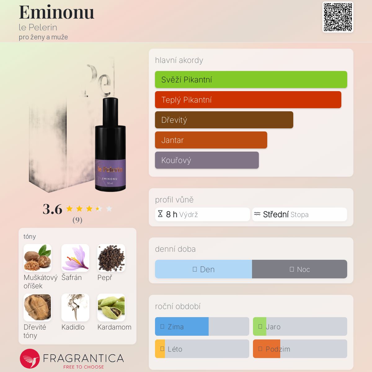 Eminonu podle le Pelerin je Woody Spicy vůně pro ženy a muže. Eminonu byl/a uveden/a v roce 2019. "Nosem" za touto vůní je Scott Morchan. Vrchní tóny jsou Muškátový oříšek, Pepř, Černý kardamom a Kmín; střední tóny jsouŠafrán, Kadidlo, Zázvor a Šeřík ; základní tóny jsou Vzácné dřevo, Agarové dřevo (oud), Pačuli, Pižmo, Guajakové dřevo a Labdanum.