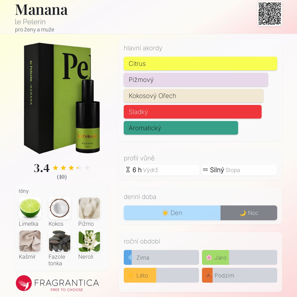 Manana podle le Pelerin je Woody Spicy vůně pro ženy a muže. Manana byl/a uveden/a v roce 2019. "Nosem" za touto vůní je Scott Morchan. Vrchní tóny jsou Limetka, Kokos, Neroli a Kardamom; střední tóny jsouPelargónie a Švestka ; základní tóny jsou Pižmo, Kašmír a Fazole tonka.
