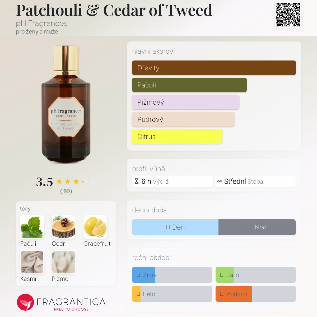 Patchouli & Cedar of Tweed podle pH Fragrances je Orientální Woody vůně pro ženy a muže. Patchouli & Cedar of Tweed byl/a uveden/a v roce 2018. "Nosem" za touto vůní je Quentin Bisch. Vrchní tóny jsou List indonéského pačuli a Grapefruit; střední tóny jsouMarocký cedr a Kašmír ; základní tóny jsou Pačuli a Pižmo.