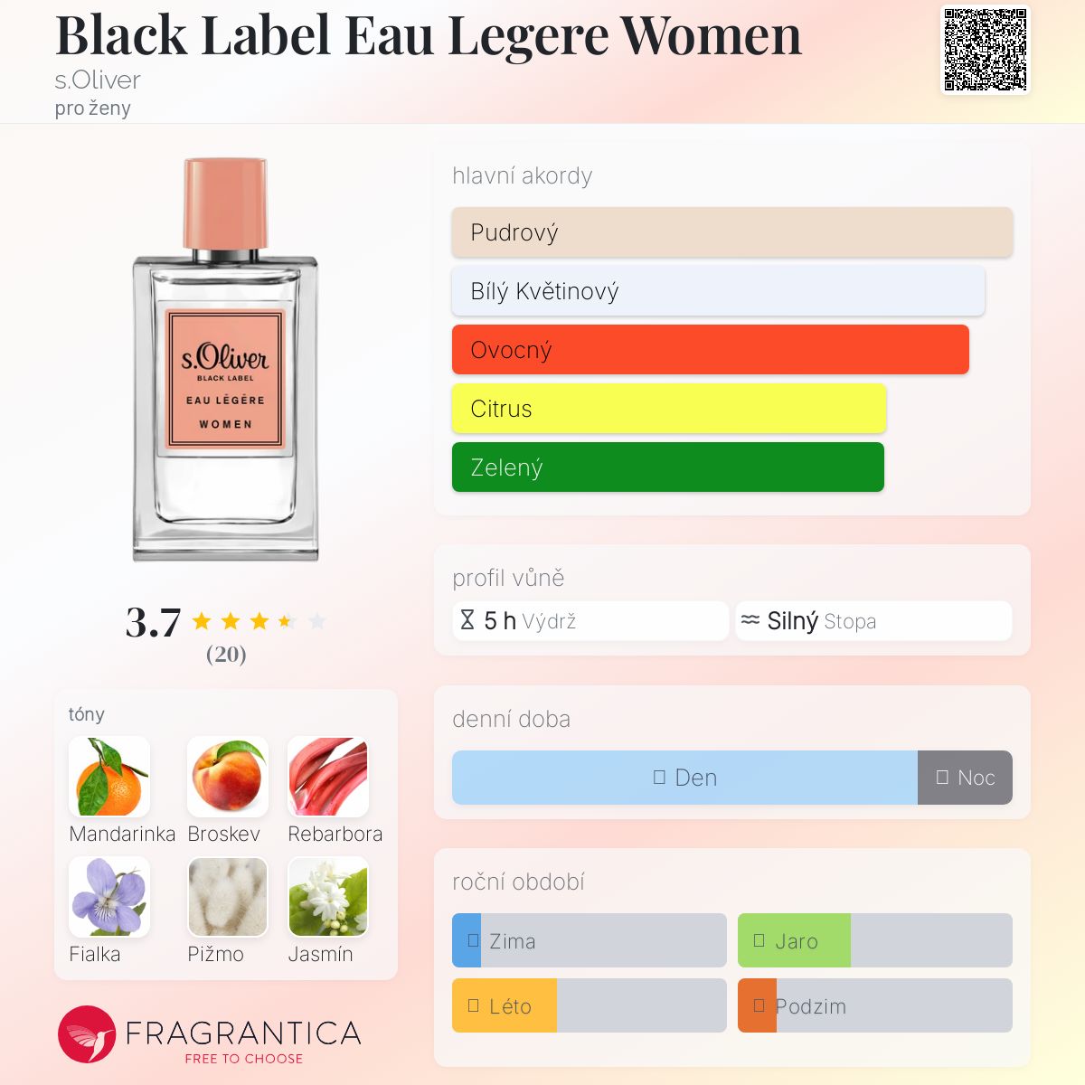 Black Label Eau Legere Women podle s.Oliver je Floral Woody Musk vůně pro ženy. Black Label Eau Legere Women byl/a uveden/a v roce 2020. Vrchní tóny jsou Mandarinka a Rebarbora; střední tóny jsouBroskev, Fialka, Jasmín a Konvalinka ; základní tóny jsou Pižmo, Santalové dřevo a Jantar (ambra).