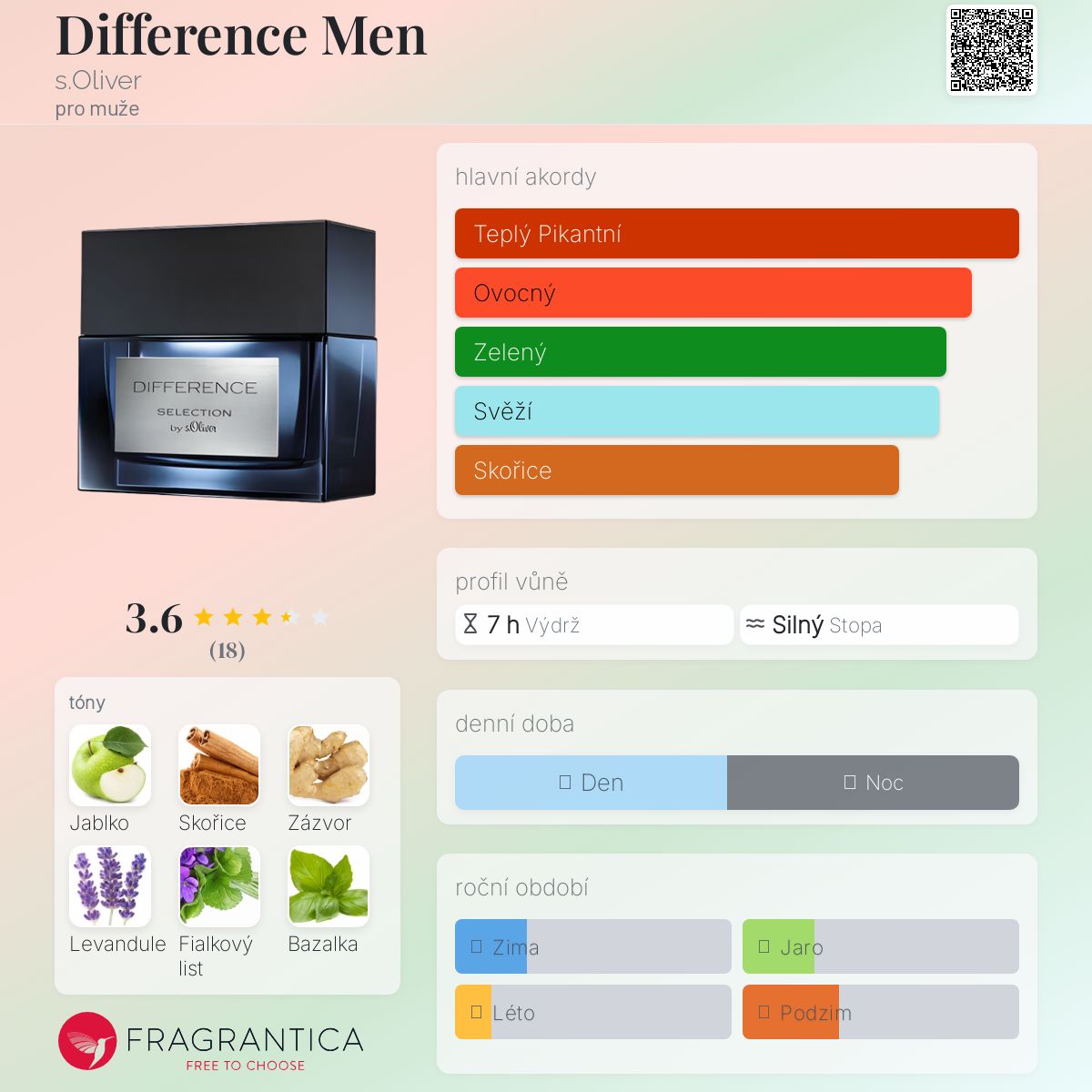 Difference Men podle s.Oliver je Aromatic Spicy vůně pro muže. Difference Men byl/a uveden/a v roce 2012. Vrchní tóny jsou Granny Smith jablko, Skořice a Zázvor; střední tóny jsouLevandule, Fialkový list a Bazalka ; základní tón je Dřevité tóny.