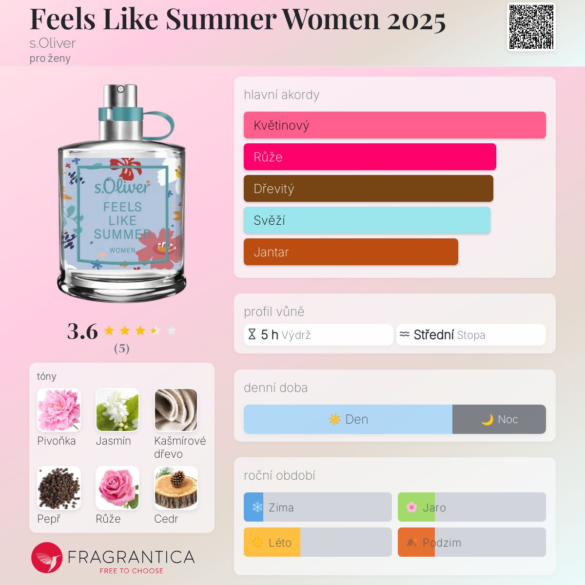 Feels Like Summer Women 2025 podle s.Oliver je Floral vůně pro ženy. Toto je nová vůně. Feels Like Summer Women 2025 byl/a uveden/a v roce 2025. Vrchní tón je Pepř ; střední tóny jsouPivoňka, Jasmín a Růže ; základní tóny jsou Kašmírové dřevo, Cedr a Jantar (ambra).