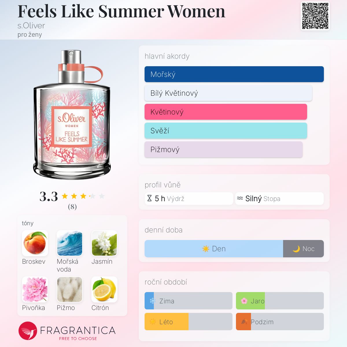 Feels Like Summer Women podle s.Oliver je Floral Fruity vůně pro ženy. Feels Like Summer Women byl/a uveden/a v roce 2017. Vrchní tóny jsou Broskev, Citrón a Čaj; střední tóny jsouMořské tóny, Jasmín a Pivoňka ; základní tóny jsou Pižmo, Ambroxan a Santalové dřevo.