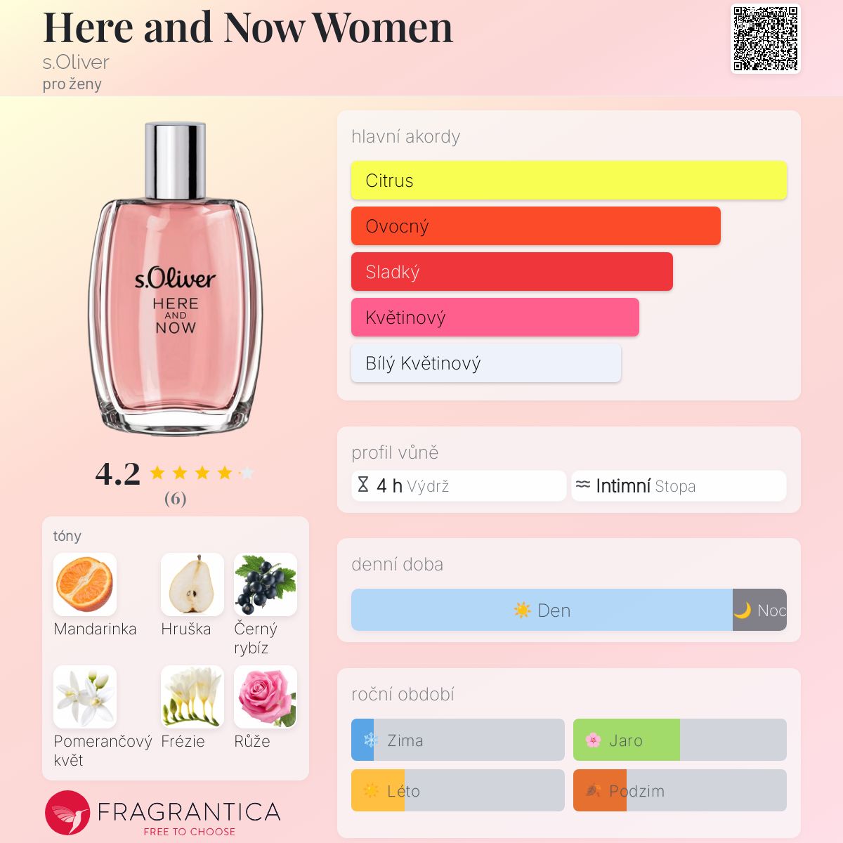 Here and Now Women podle s.Oliver je vůně pro ženy. Here and Now Women byl/a uveden/a v roce 2023. Vrchní tóny jsou Mandarinka, Hruška a Černý rybíz; střední tóny jsouPomerančový květ, Frézie a Růže ; základní tóny jsou Pačuli, Vanilka a Pižmo.