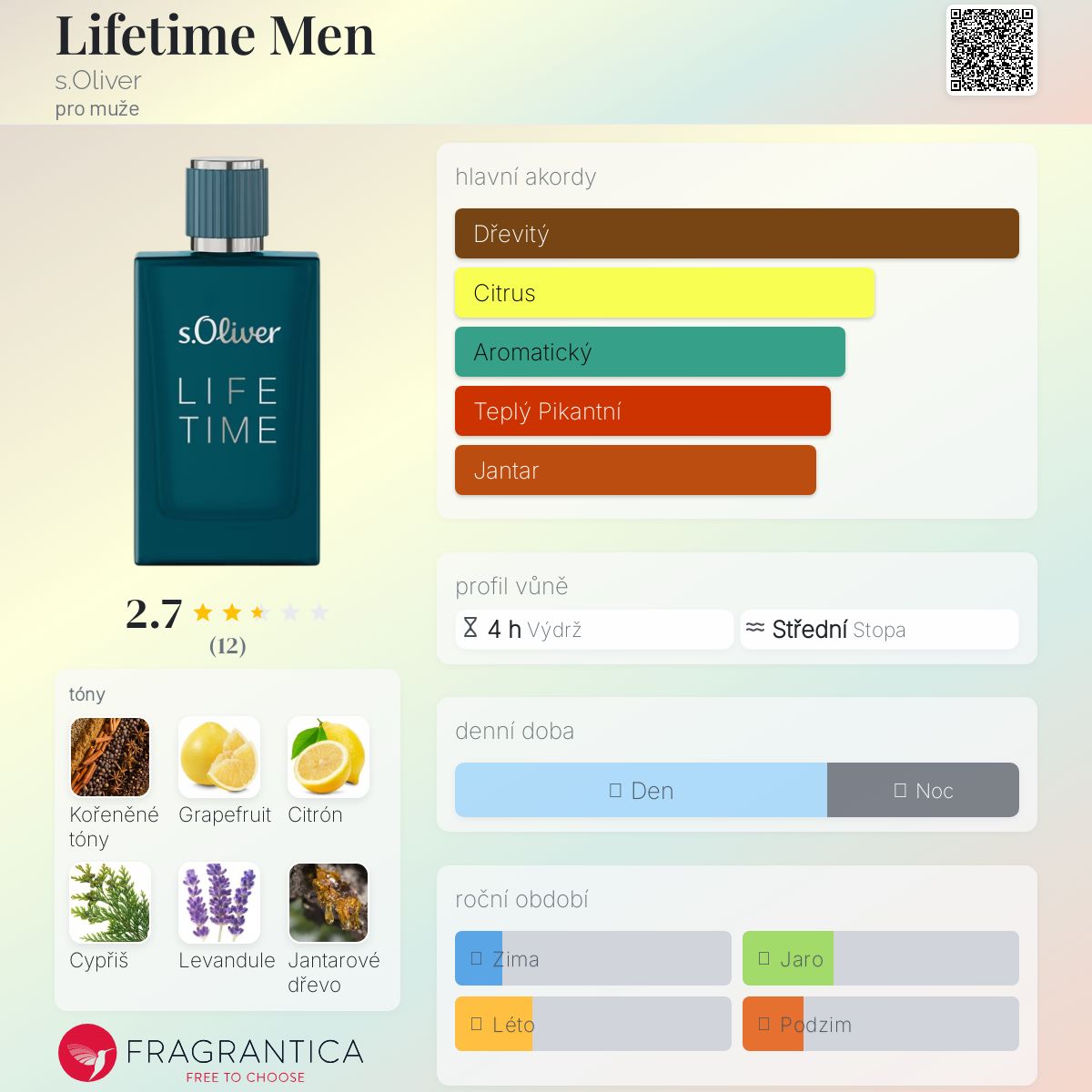 Lifetime Men podle s.Oliver je vůně pro muže. Toto je nová vůně. Lifetime Men byl/a uveden/a v roce 2024. Vrchní tóny jsou Koření, Grapefruit a Citrón; střední tóny jsouCypřiš, Levandule a Cedr ; základní tóny jsou Jantarové dřevo, Kašmírové dřevo a Santalové dřevo.