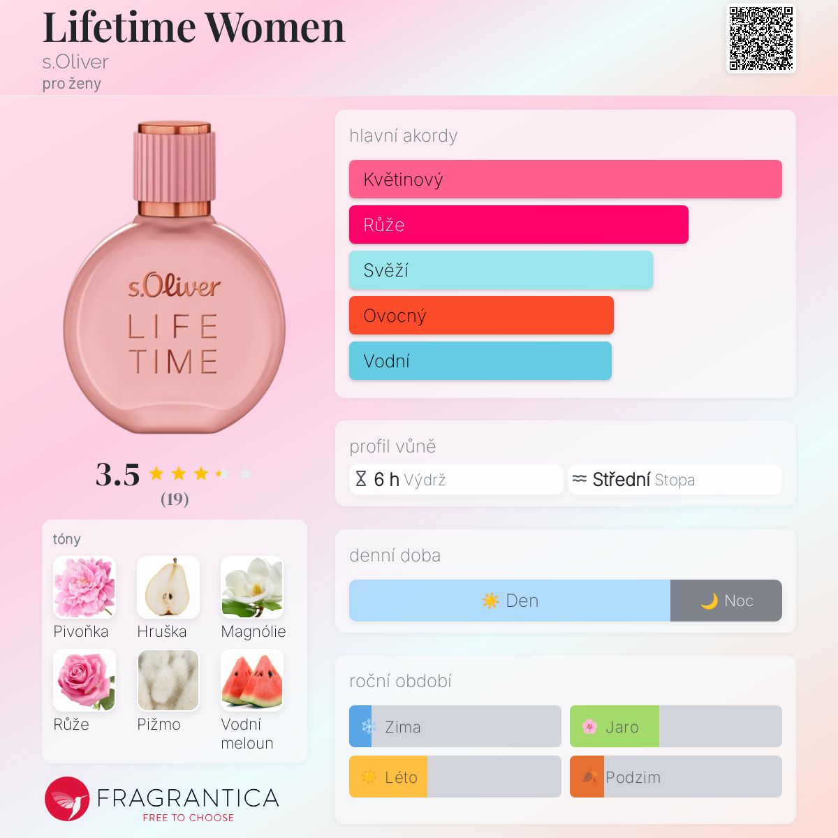 Lifetime Women podle s.Oliver je Floral Fruity vůně pro ženy. Toto je nová vůně. Lifetime Women byl/a uveden/a v roce 2024. Vrchní tóny jsou Hruška a Vodní meloun; střední tóny jsouPivoňka, Magnólie, Růže a Kosatec ; základní tóny jsou Pižmo a Santalové dřevo.