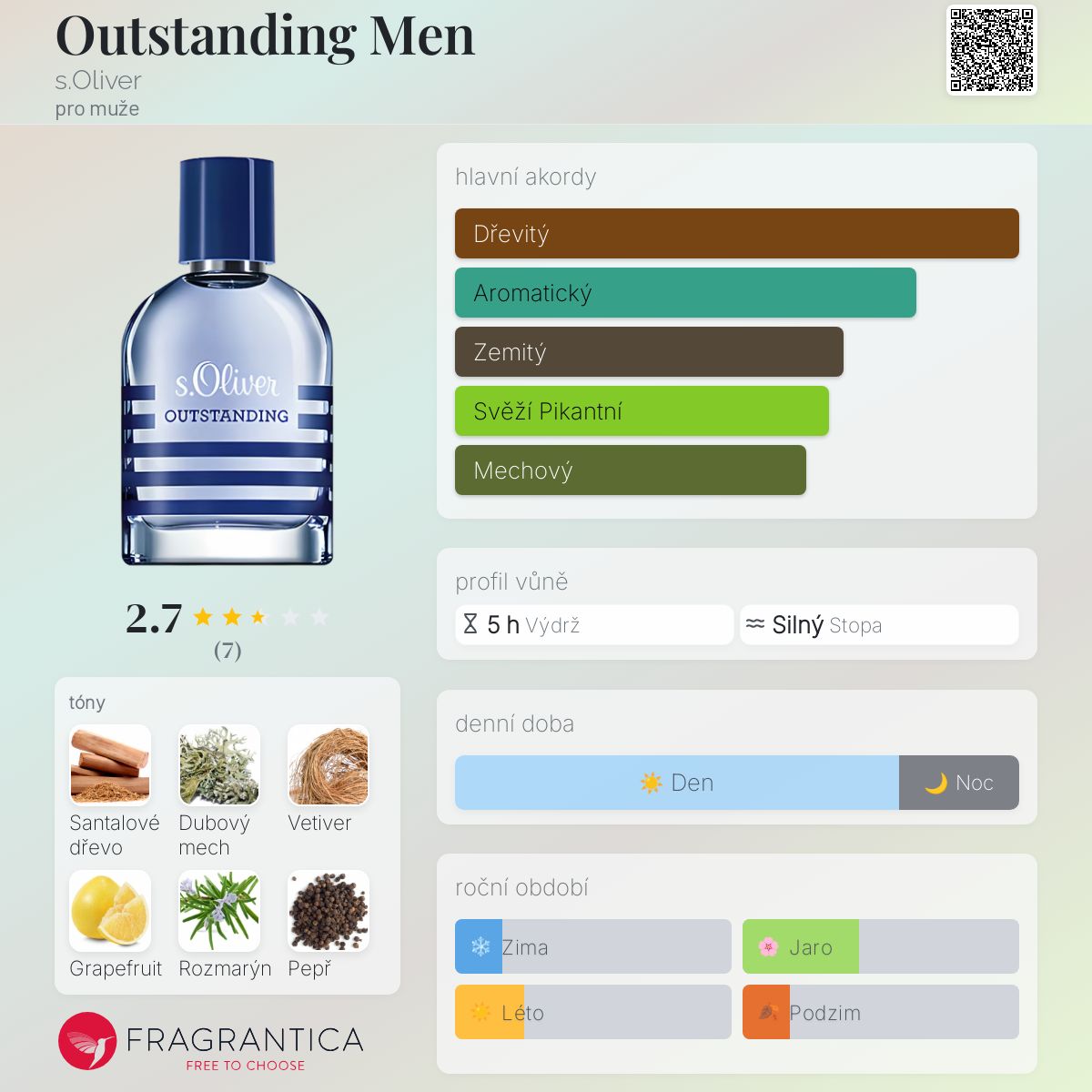 Outstanding Men podle s.Oliver je Woody Aromatic vůně pro muže. Outstanding Men byl/a uveden/a v roce 2015. Vrchní tóny jsou Grapefruit, Rozmarýn a Černý pepř; střední tóny jsouŠalvěj, Levandule a Fialkový list ; základní tóny jsou Santalové dřevo, Mech a Vetiver.
