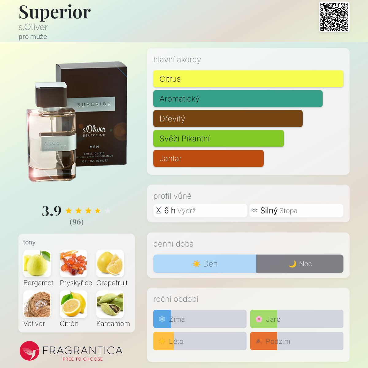 Superior podle s.Oliver je Woody Aromatic vůně pro muže. Superior byl/a uveden/a v roce 2010. Vrchní tóny jsou Bergamot, Grapefruit a Citron amalfi; střední tóny jsouKardamom, Kořen orris a Rozmarýn ; základní tóny jsou Pryskyřice, Vetiver a Virginský cedr.
