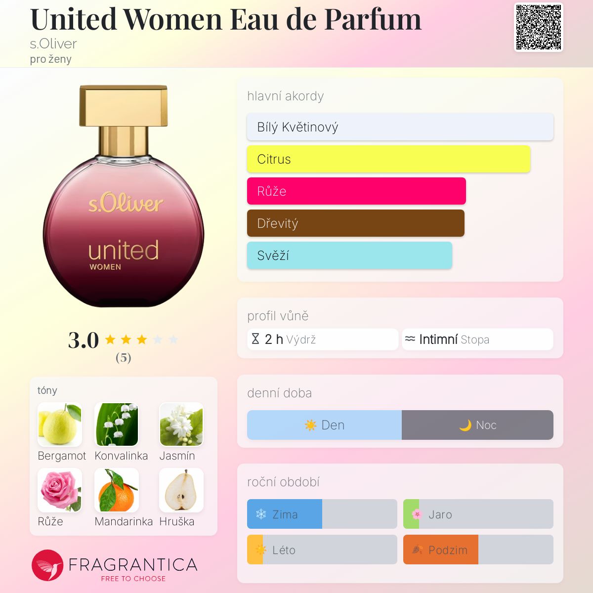 United Women Eau de Parfum podle s.Oliver je Floral Woody Musk vůně pro ženy. Toto je nová vůně. United Women Eau de Parfum byl/a uveden/a v roce 2025. Vrchní tóny jsou Bergamot, Mandarinka a Hruška; střední tóny jsouKonvalinka, Jasmín a Růže ; základní tóny jsou Cedr, Pižmo a Kašmírové dřevo.